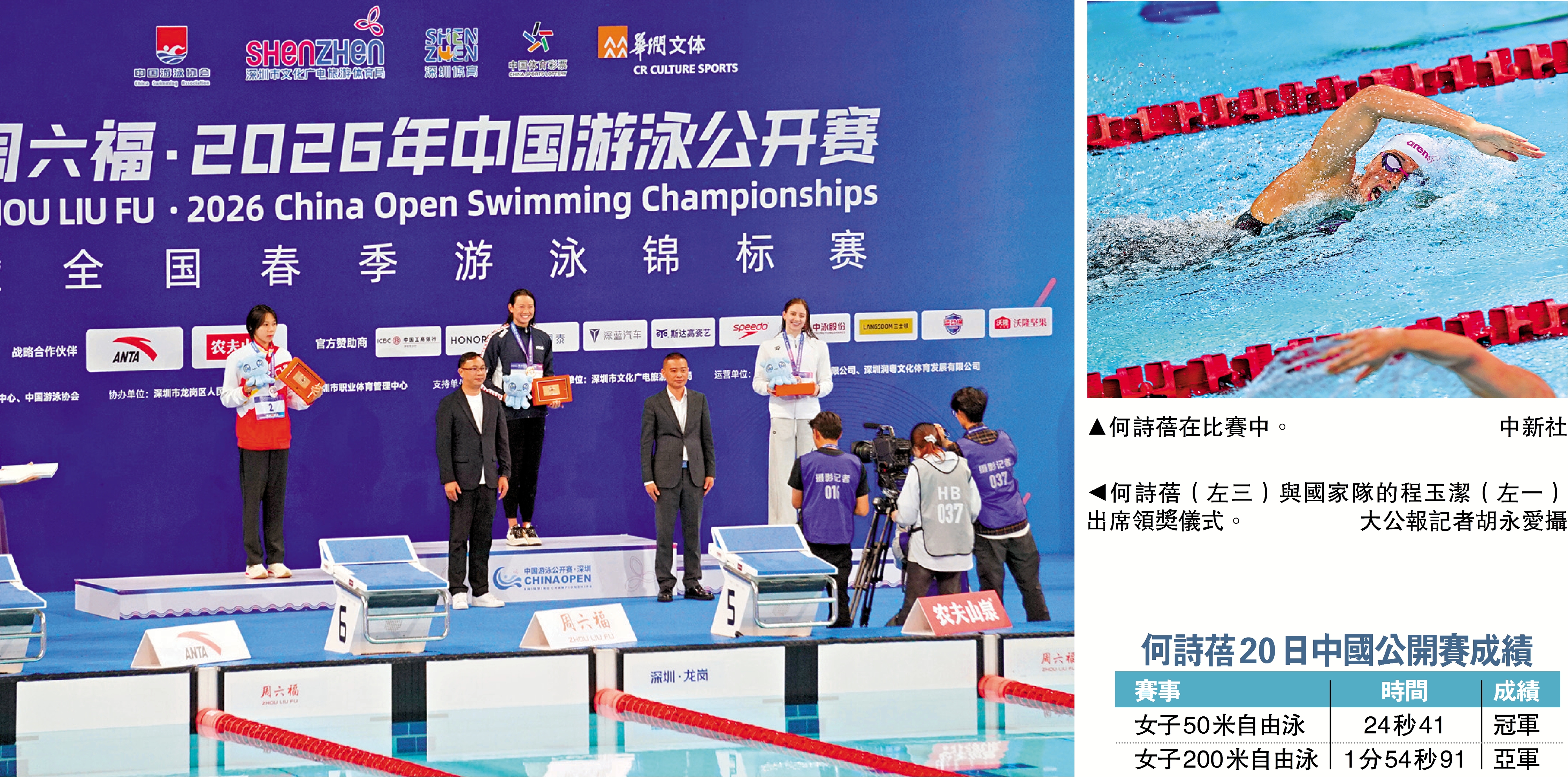 3月20日,中國香港「女飛魚」何詩蓓在2026年中國游泳公開賽暨全國春季游泳錦標賽連續參與兩項賽事,首先在非主項的50米自由泳斬獲一枚金牌,然後再於200米自由泳奪取銀牌,連同首日摘下的100米自由泳金牌,累計今次在深圳大運中心游泳館內獨攬2金1銀。何詩蓓直言,能夠贏取50米自由泳金牌,實屬意料之外。\大公報記者 胡永愛、李薇深圳報道