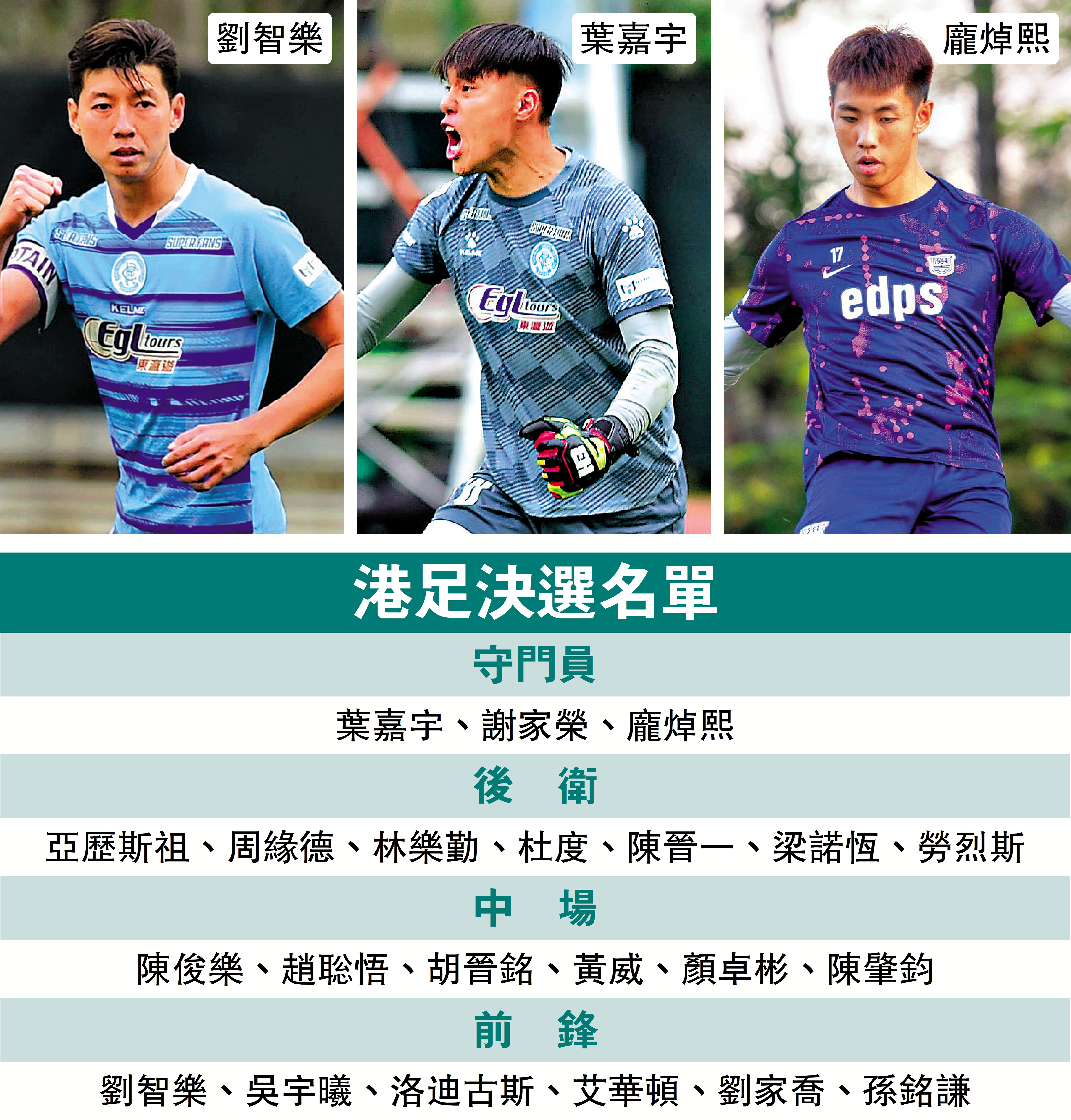 至於成功入選的劉智樂、葉嘉宇及龐焯熙,3人以往從未在國際A級賽為港足上陣,但劉智樂、龐焯熙就有出戰省港盃、賀歲盃等賽事,今次繼續獲得盧比度青睞,有望取得上陣機會。