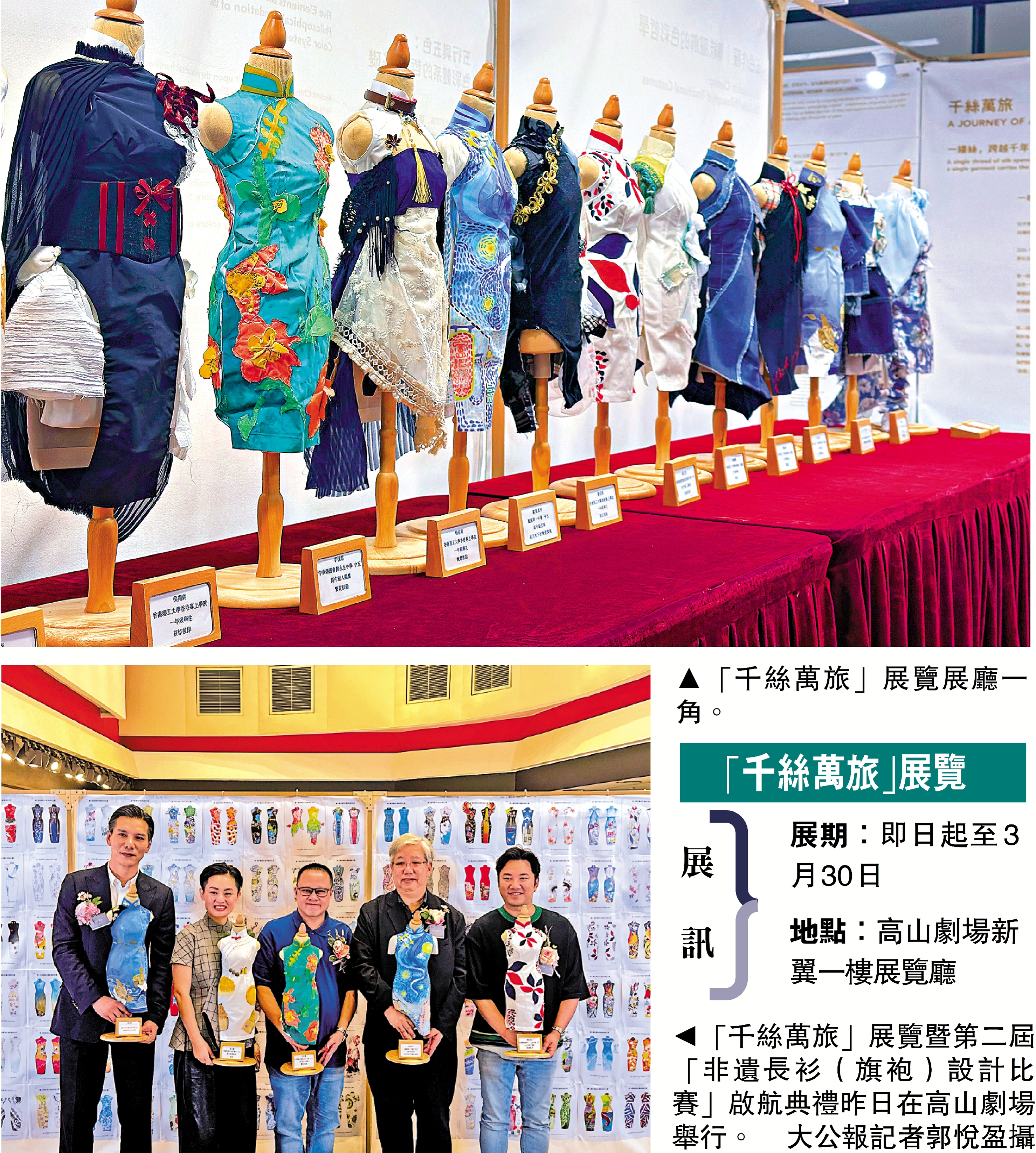 【大公報訊】記者郭悅盈報道:「千絲萬旅」展覽即日起於高山劇場舉行,並為第二屆非遺長衫(旗袍)設計比賽揭開序幕。展覽透過梳理華服歷史、展示布料工藝及設計過程,呈現由絲線到成衣的演變脈絡,並結合沉浸式體驗,讓觀眾了解中華服飾文化的發展與設計思維。展覽同場設有「絲綢幻旅」VR體驗,帶領觀眾感受絲路文化與製作過程。展覽展期至3月30日,免費入場。