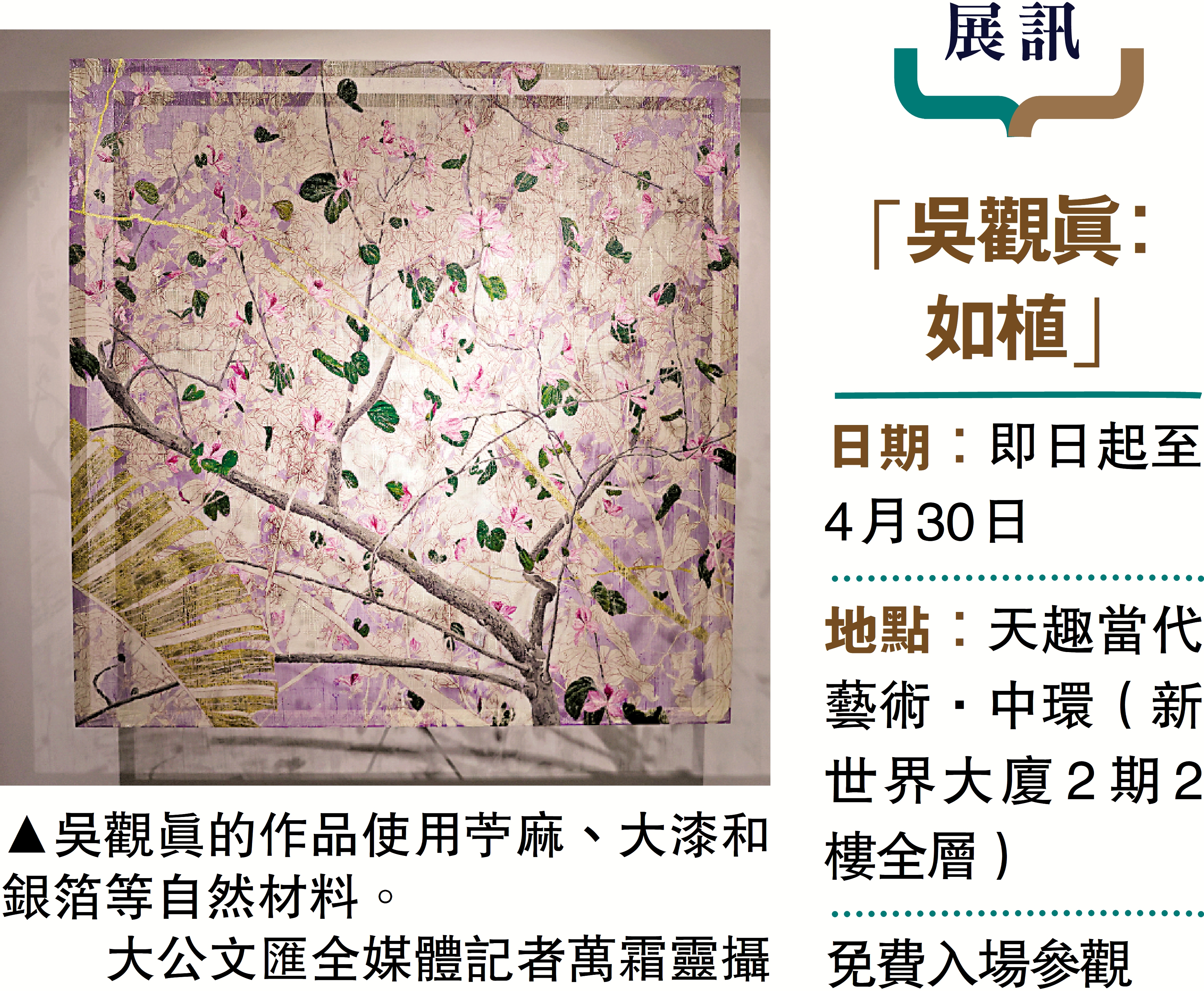 【大公報訊】大公文匯全媒體記者丁寧報道:藝術家吳觀真的個人展覽「吳觀真:如植」正在「天趣當代藝術·中環」舉行,展覽時間從即日起至4月30日。展覽由沈奇嵐擔任學術主持,林秉瀚任策展人,張朱宇、王鈺君任出品人。