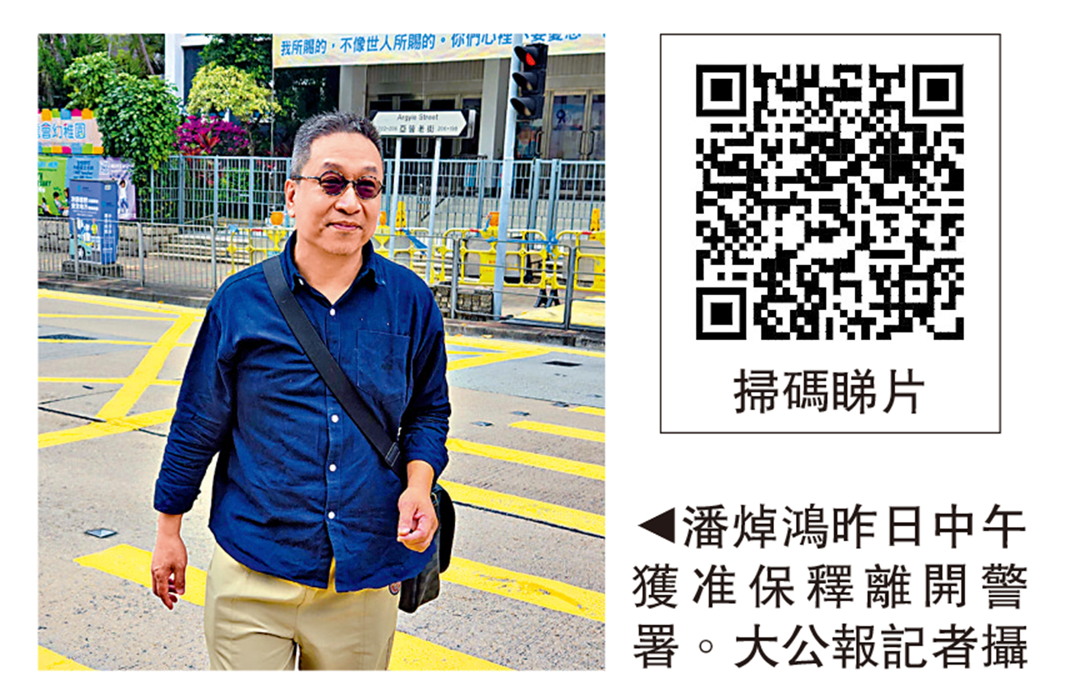 【大公報訊】記者馮錫雄報道:口罩商涉嫌在新冠疫情期間詐騙600萬元百分百擔保貸款,公司董事潘焯鴻被警方扣留逾40小時後,昨日中午獲准保釋離開警署。消息稱,除了潘焯鴻與其妻子被拘捕之外,其餘四名被捕員工之中,包括曾經在潘焯鴻的公司諾翹生物化學工作、網名「潘小文」的資深傳媒人潘麒智。