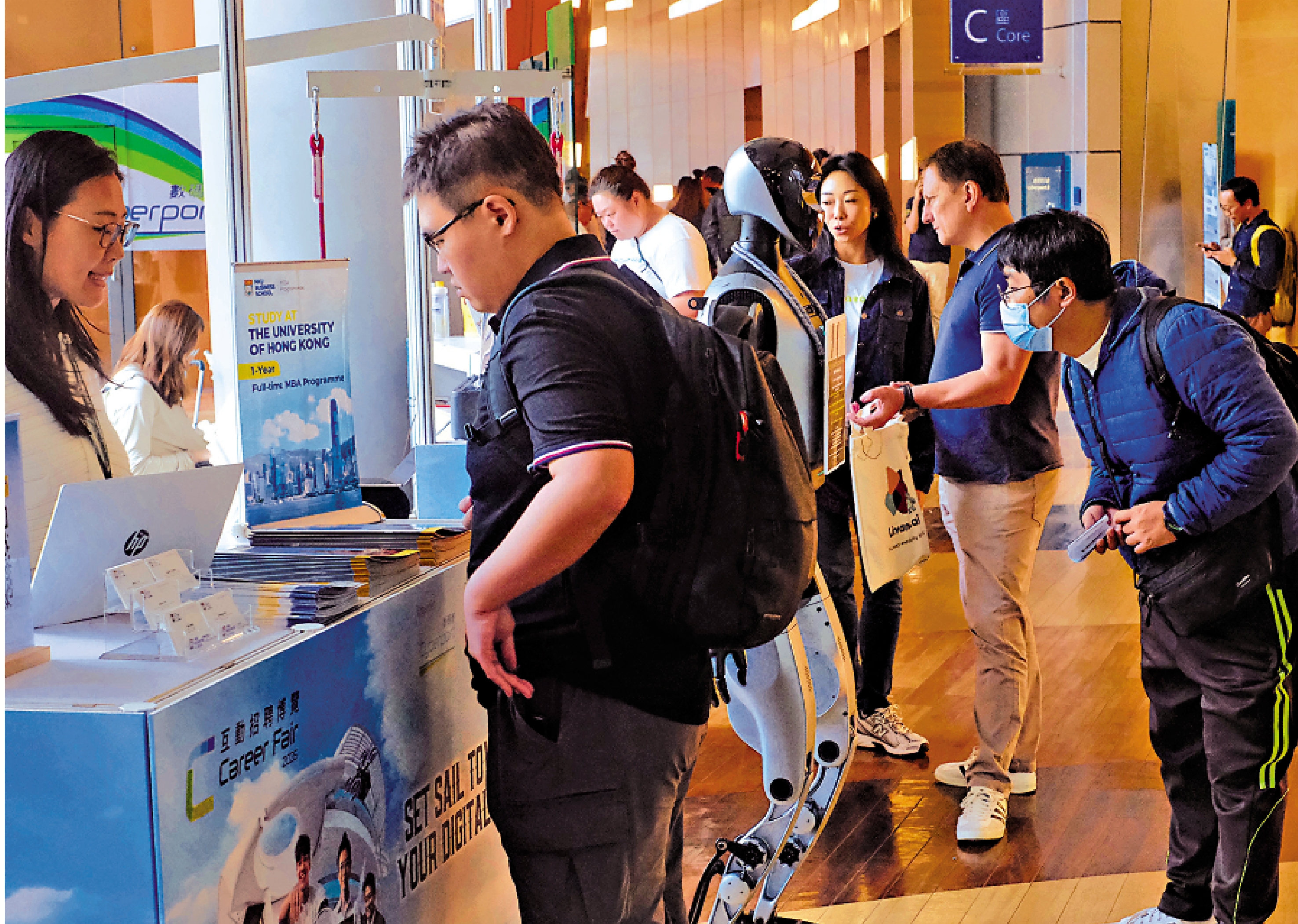 今年的數碼港互動招聘博覽首次引入多元互動環節,透過包括百度智能駕駛介紹、無人機足球比賽等,向參與者展示人工智能(AI)、大數據、低空經濟等21個創科行業的前景。
