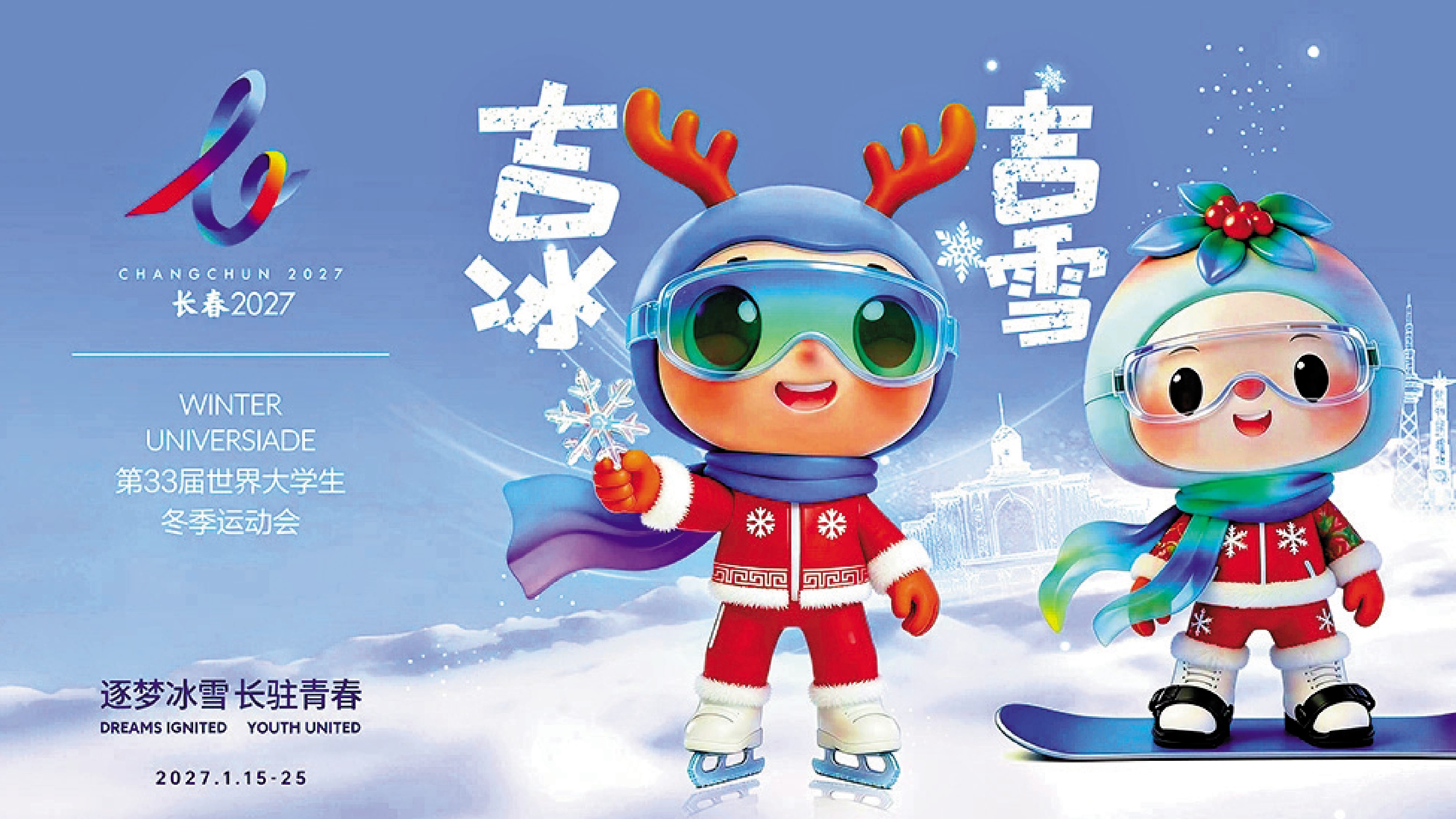 吉祥物「吉冰」和「吉雪」由鄭州西亞斯學院設計團隊創作完成。其中「吉冰」以吉林梅花鹿為原型,鹿角昂揚如林間新枝,象徵着大學生蓬勃向上的朝氣;「吉雪」以長白山人參為原型,寓意着生生不息的活力。