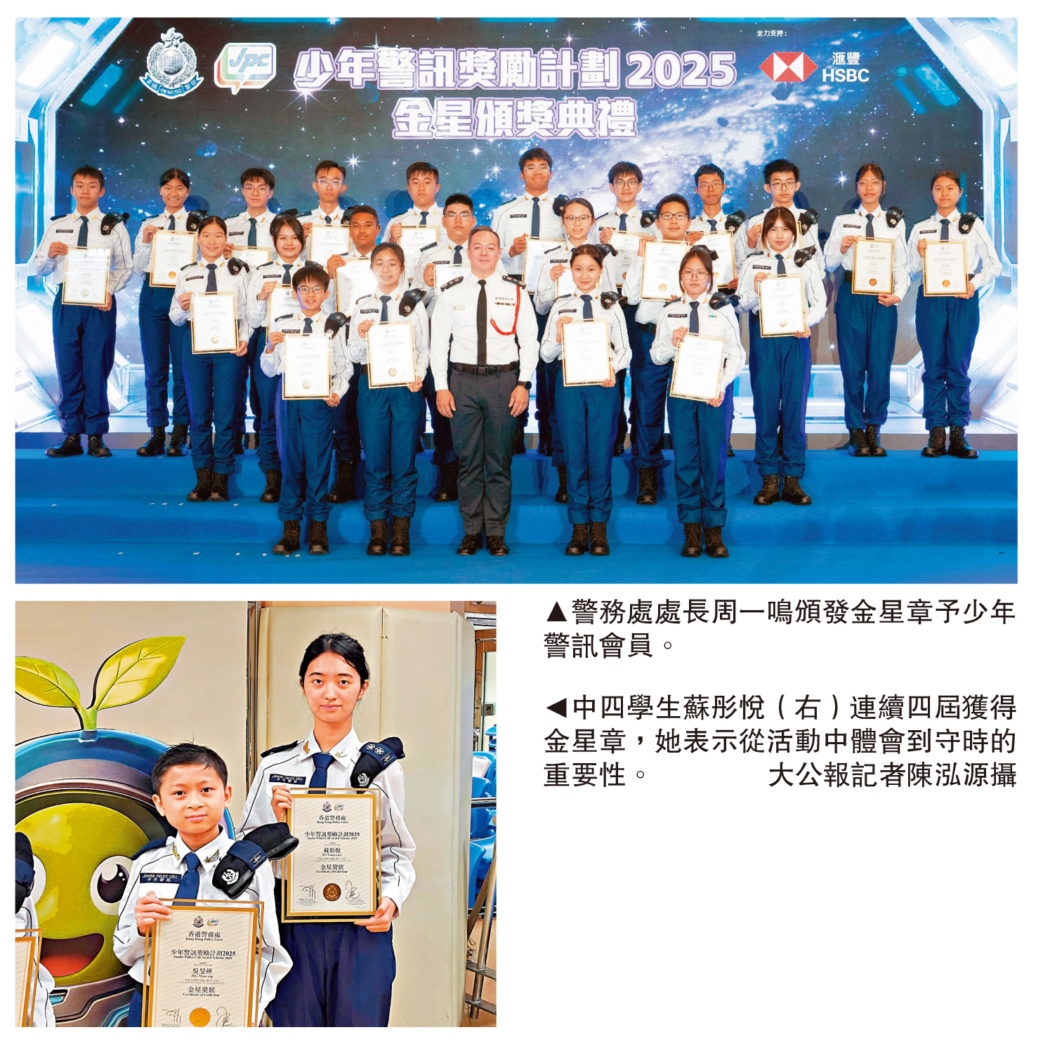 【大公報訊】記者陳泓源報道:「少年警訊獎勵計劃2025金星頒獎典禮」昨日舉行,今年共有超過1400人得獎,創歷屆新高,其中153人獲得金星章。有中四學生連續四屆獲得金星章,認為獲獎心得是承擔責任、團隊合作與自律精神;有雙胞胎兄弟參與計劃後,從內向變外向勇敢,父親認為計劃能夠培養自主學習能力。警務處處長周一鳴鼓勵得獎學員繼續秉持精神,為社會作出貢獻。