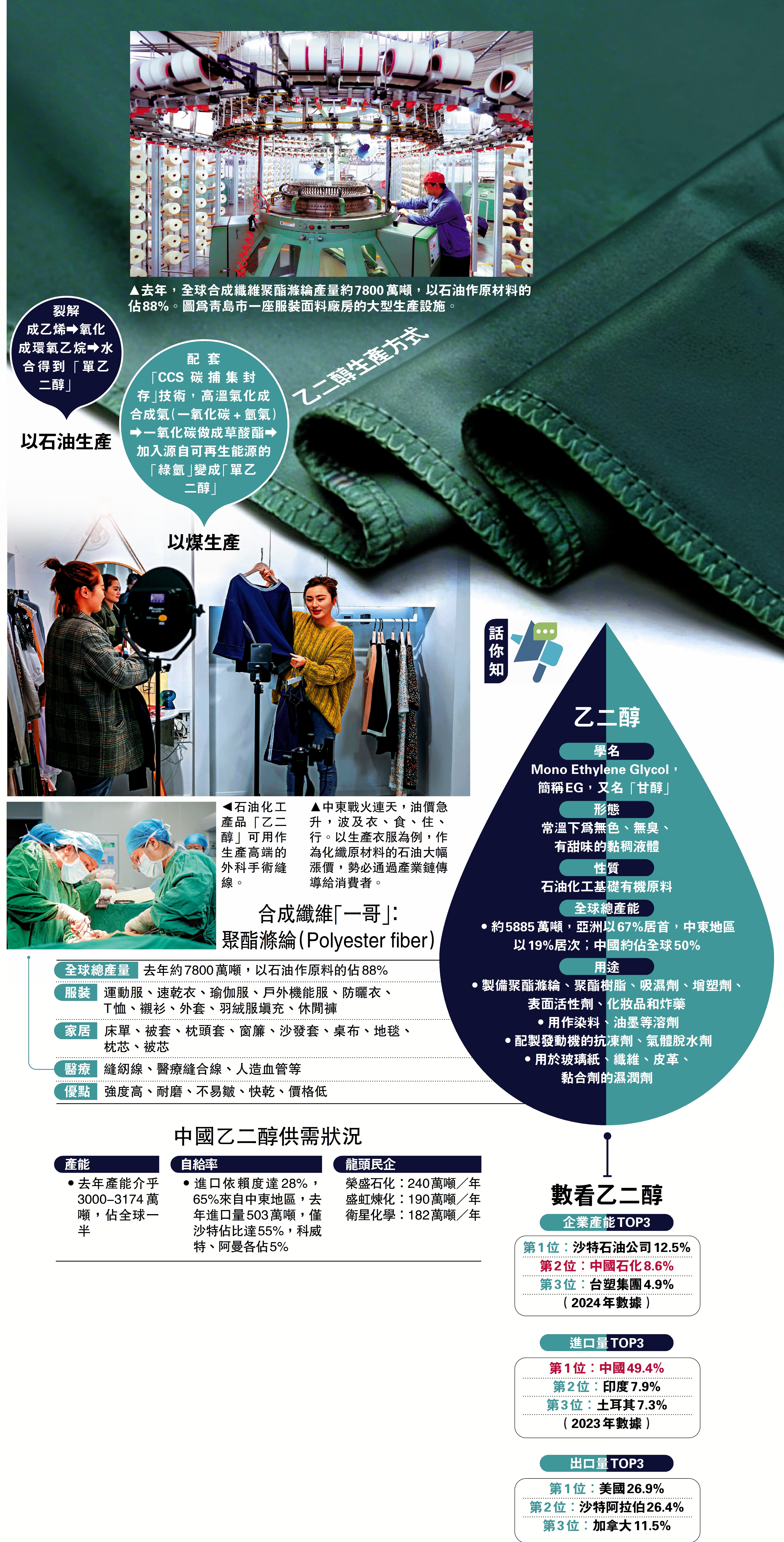去年,合成纖維聚酯滌綸(Polyester fiber)產量約7800萬噸,以「油基乙二醇」生產的聚酯滌綸佔全球產量88%。新加坡PCS、印尼Chandra Asri和韓國Yeochun NCC等石化企業,因供應中斷相繼官宣供應不可抗力,裝置被迫降負運行或關停,乙二醇等關鍵化工品供應收緊預期持續升溫。不難想像,霍爾木茲海峽石化產品外運長期受阻,將帶動全球服裝價格持續上調,全球也要付「中東戰爭稅」。