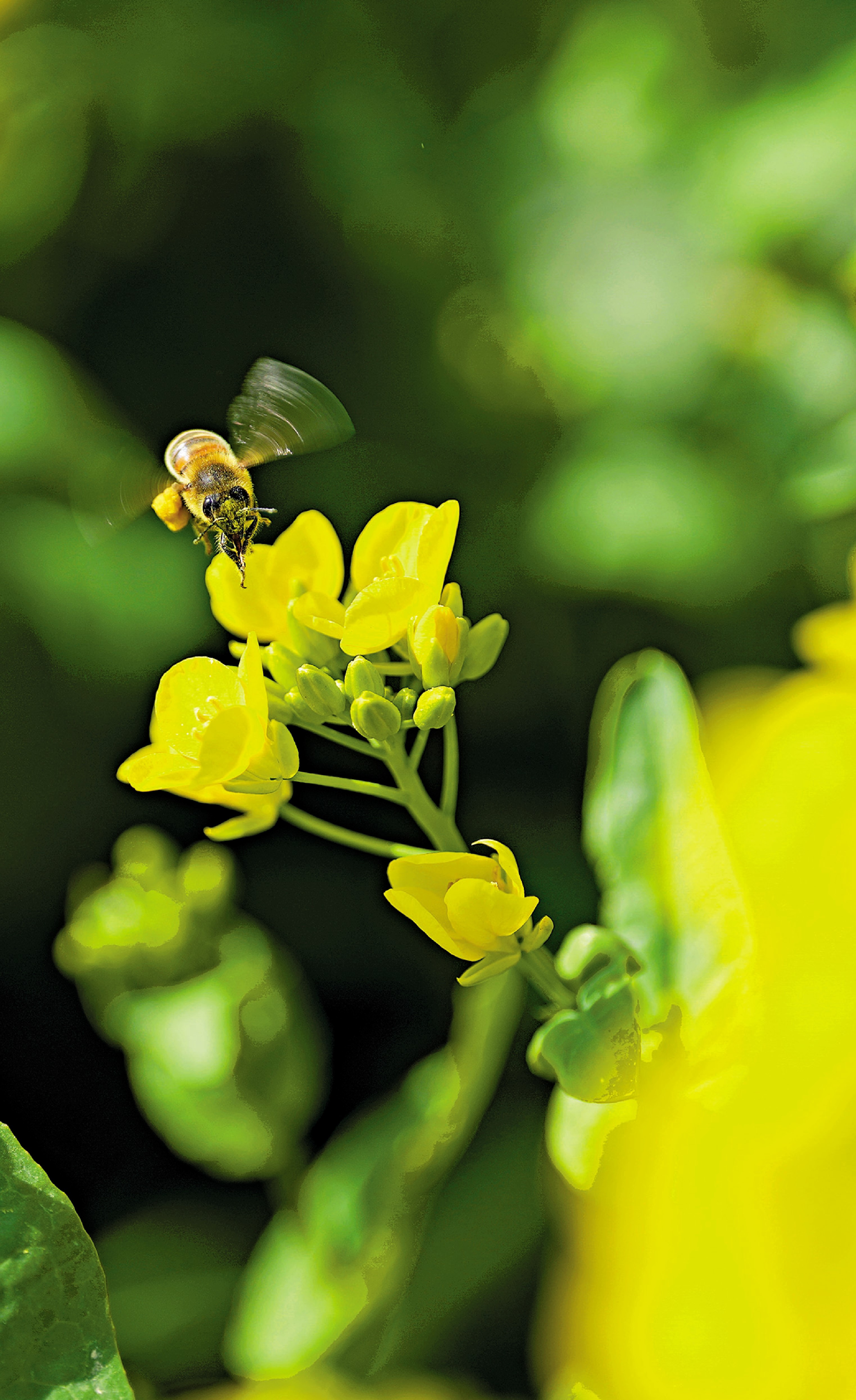 春日,山西省運城市鹽湖區西姚村的油菜花競相開放,吸引不少遊客前來觀賞。圖為一隻蜜蜂在花間採蜜。\新華社