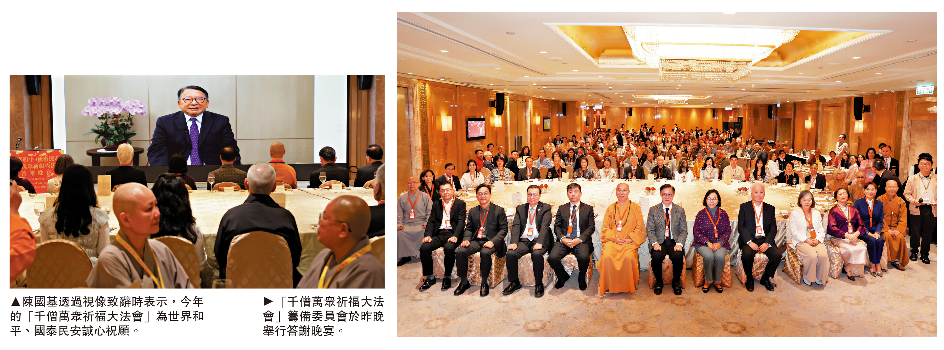 大會主席、香港特區政府政務司司長陳國基透過視像致辭時表示,香港有幸在國家的護佑之下,社會安定,市民生活安穩;然而,當前世界局勢複雜多變,不少地區正受戰火困擾,人民飽受苦難,今年的「千僧萬眾祈福大法會」是以佛門的慈悲精神,集合萬眾的善念,為世界和平、國泰民安誠心祝願,亦為宣揚和平的信息獻出香港的一分力量。\大公文匯全媒體記者盧慧穎(文) 萬霜靈(圖)
