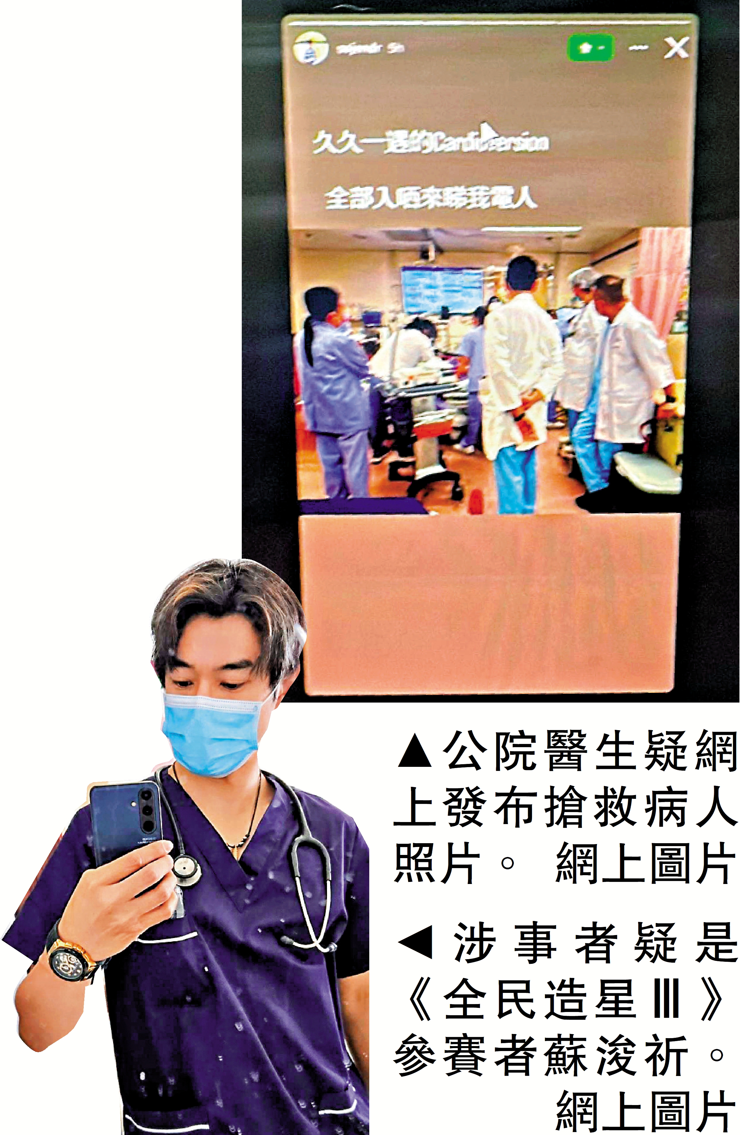消息傳開後,發帖者迅速刪除帖文,一度將賬戶由公開轉為私人閱覽。根據網民上傳的截圖顯示,涉事醫生IG名稱為「sojendr」,相關照片顯示有多名醫護人員正圍着接受搶救的病人。據悉,涉事醫生是曾參加ViuTV選秀真人騷《全民造星Ⅲ》、綽號「靚仔醫生」的蘇浚祈(Jensen)。