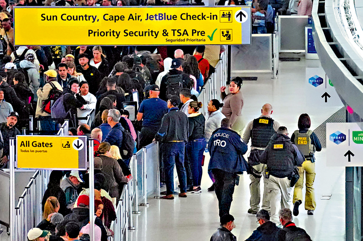 【大公報訊】綜合CNN、《紐約時報》報道:22日晚發生客機撞消防車事故之前,美國紐約拉瓜迪亞機場就已經因安檢人員不足而陷入混亂,旅客被迫排隊數小時。由於兩黨圍繞國土安全部撥款爭執不下,該部門及其下屬的運輸安全管理局(TSA)等機構停擺,數十萬僱員自2月以來一直無薪工作,很多人告假。過去一周,TSA近一成僱員缺勤,美國各地機場安檢系統人手短缺,旅客等候時間大大延長。美國總統特朗普23日開始向機場派遣移民與海關執法局(ICE)特工,協助安保工作並「抓捕非法移民」,引起旅客不安。