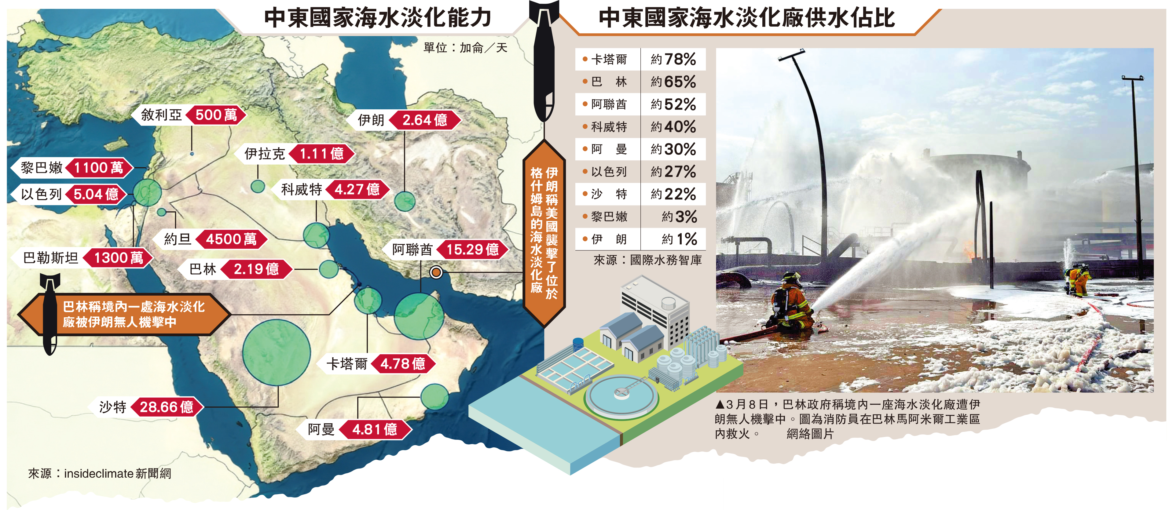 美國和以色列持續打擊伊朗,令中東多國的海水淡化及能源設施遇襲風險激增。伊朗媒體23日列出伊朗重點關注的中東地區11處發電與海水淡化站等目標。專家警告,若區內海水淡化設施被摧毀,中東約1億人將無法獲得常規飲用水,恐造成嚴重人道災難。評論指,海水淡化設施已成為中東地區暴露在外的「戰略軟肋」,也是伊朗的最後王牌殺手鐧。\大公報記者 陳明