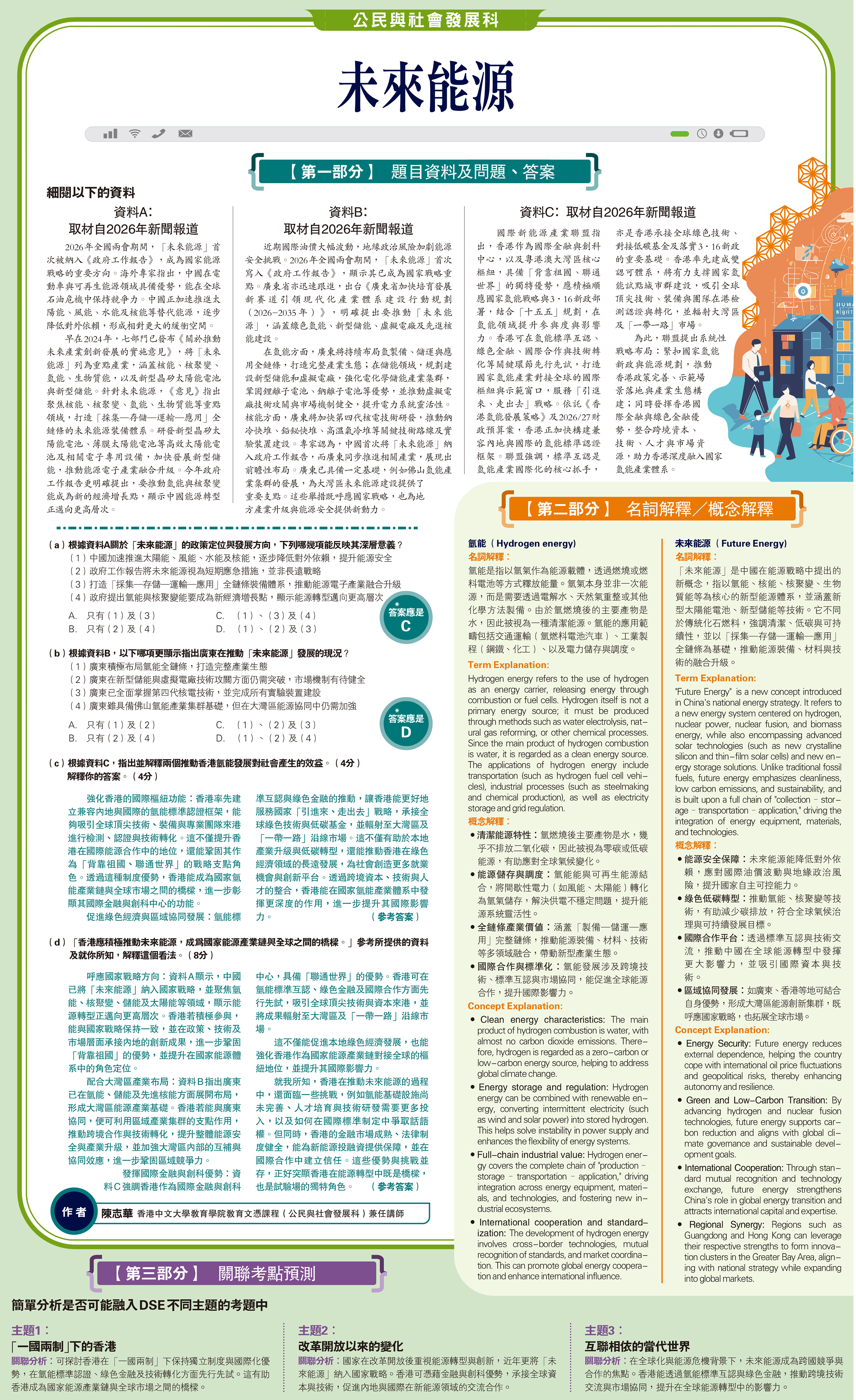 (d)「香港應積極推動未來能源,成為國家能源產業鏈與全球之間的橋樑。」參考所提供的資料及就你所知,解釋這個看法。(8分)