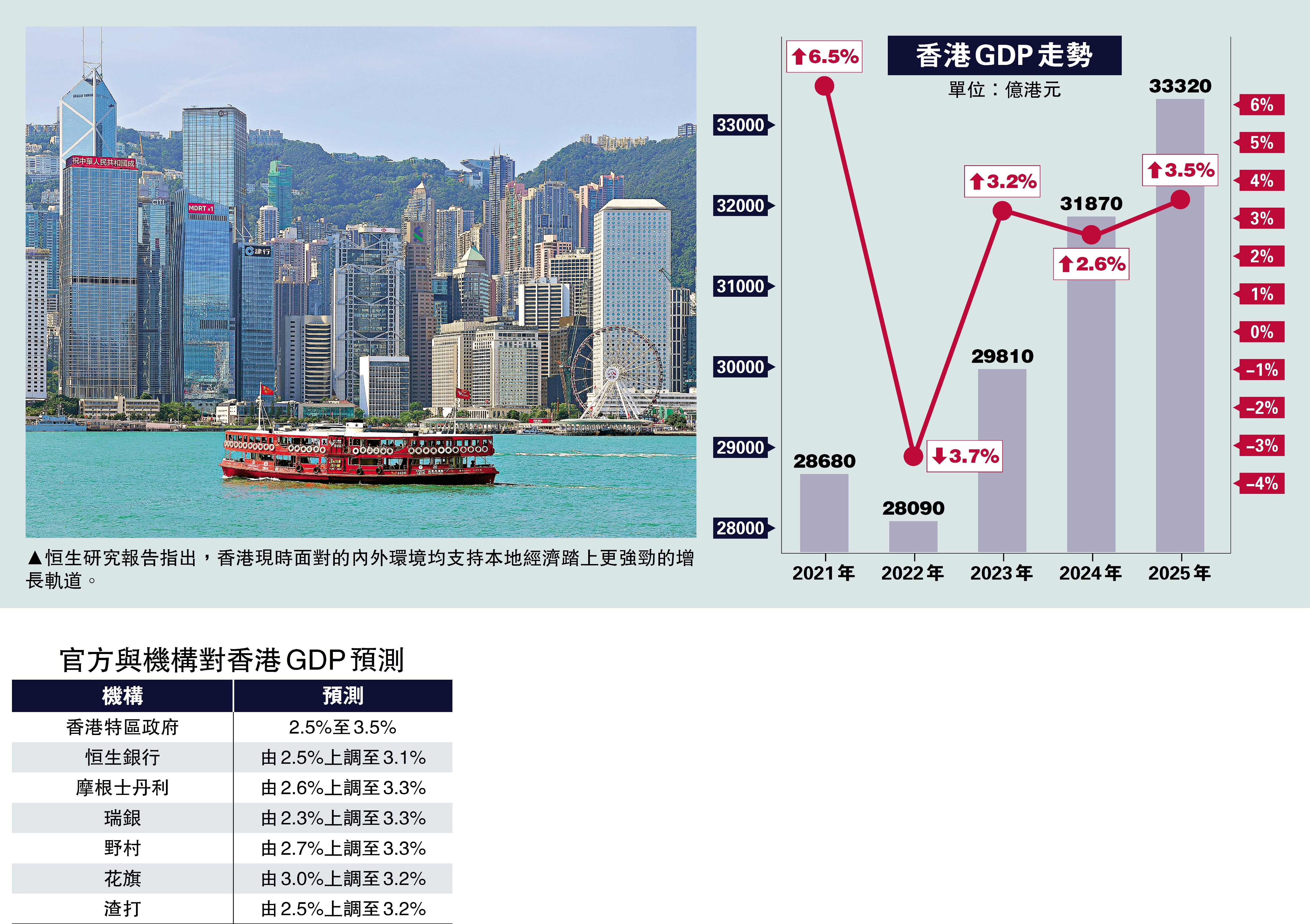 恒生報告表示,認同香港短期經濟展望較早前趨向正面,並將對香港2026年經濟增長預測,由原先的2.5%上調至3.1%。該行認為,香港現時面對的內外環境均支持本地經濟踏上更強勁的增長軌道。