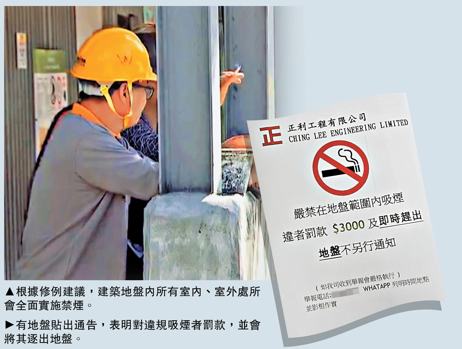 除針對個人行為,承建商亦須負起管理責任;修例建議要求承建商採取合理步驟確保地盤內沒有人吸用或攜帶燃着的指明吸煙產品,違反規例的承建商,最高可罰款40萬港元。勞工處正全速推行修訂有關法例工作,預計今年中將修例建議提交立法會審議。\大公報記者 黃知行
