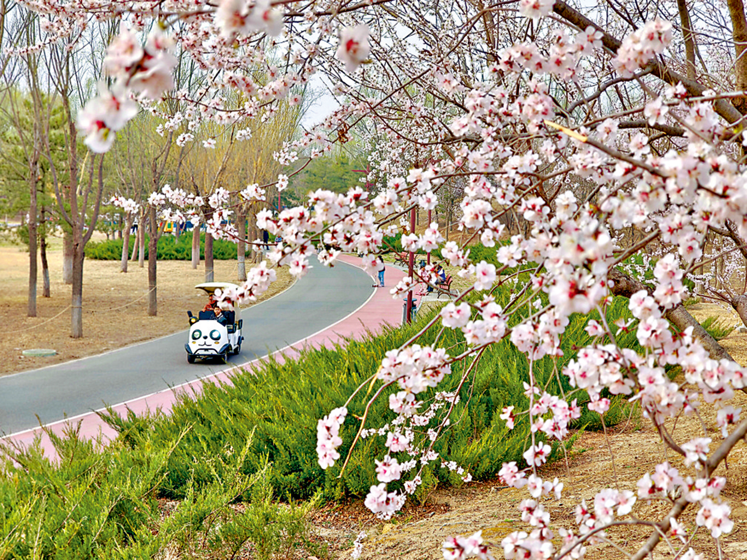 出了園子,沿着路邊走,遇見三三兩兩騎行者,陸陸續續往前趕,抬眼望,前方一排花樹,櫻白桃粉,花影成蓋。人行樹下,落英繽紛。騎行者們聚在花樹下拍照,又沿着花廊前行……他們可真會找地方。