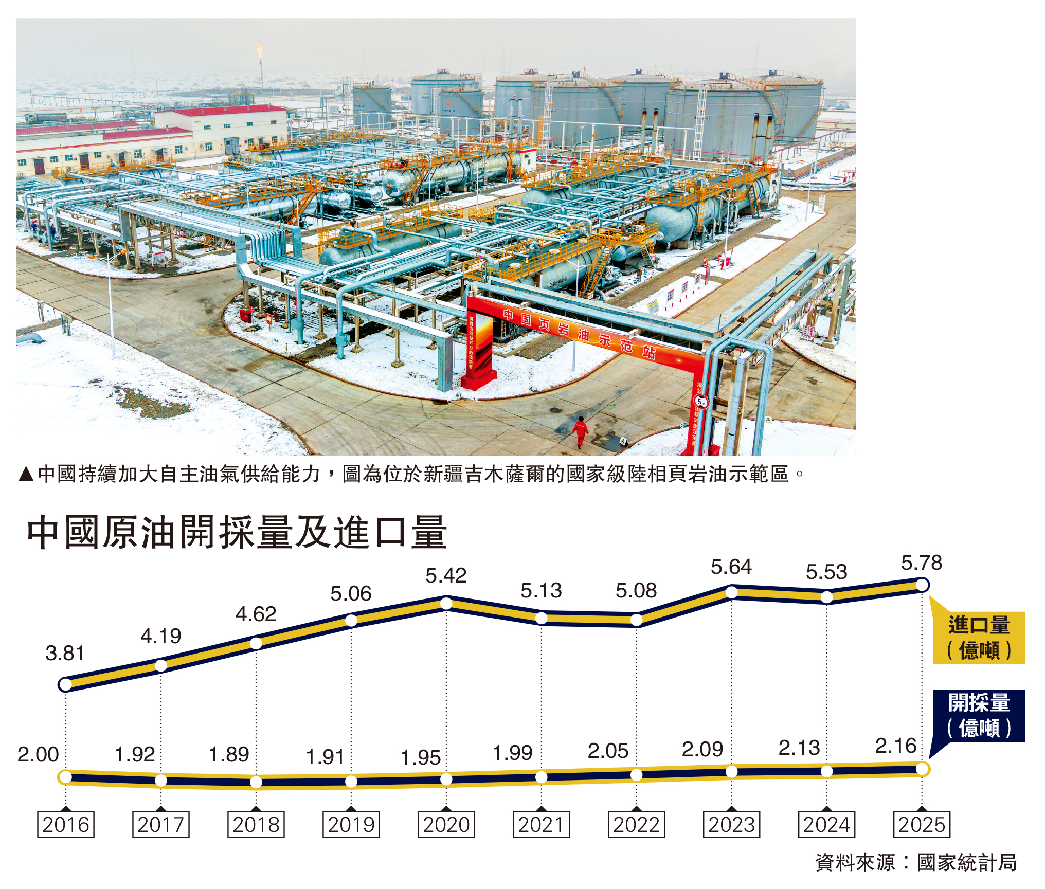 2025年中國原油開採量、原油進口量、煉廠原油加工量分別為2.2億噸、5.8億噸和7.4億噸。劉紅介紹,今年將持續加大鄂爾多斯、渤海灣、四川、塔里木、松遼、準噶爾等重點含油氣盆地常規資源勘探開發;同時,保持較高的投資強度和產能建設力度,確保原油穩產、天然氣持續較快增產。海外進口方面,將統籌國際國內「兩種資源、兩個市場」,拓展全方位國際合作,着力打造靈活有效的貿易體系。