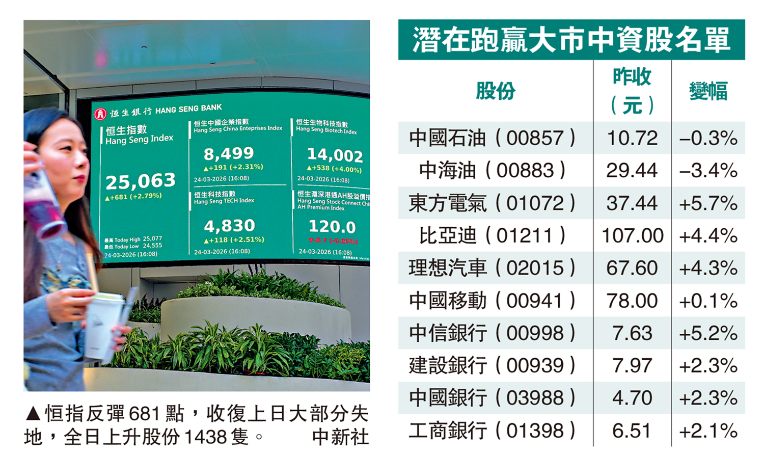 儘管中東局勢訊息混亂,無礙港股資金入市動力。恒指昨日反彈681點,收報25063點,收復上日大部分失地,在250天線前止步。主動沽盤減少,主板成交額3030億元,較上日減少656億元。全日上升股份1438隻,下跌股份481隻。消費股漲幅靠前。老鋪黃金(06181)股價升16.1%,收報648.5元,是升幅最大藍籌;康師傅(00322)股價升9.9%,收報13.22元。醫藥股升幅顯著,藥明康德(02359)股價升10.6%,收報113.6元;信達生物(01801)股價升5.2%,收報81.55元。