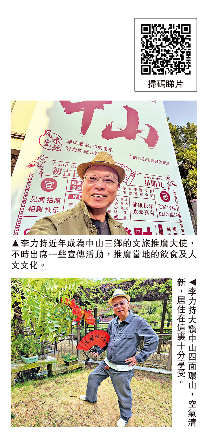 說到自己在中山定居的地方,李力持忍不住笑出了聲:「四面環山,空氣清新,早上都是被小鳥嘰嘰喳喳地吵醒,真的很享受。」他形容,在中山三鄉生活的幸福感很強。