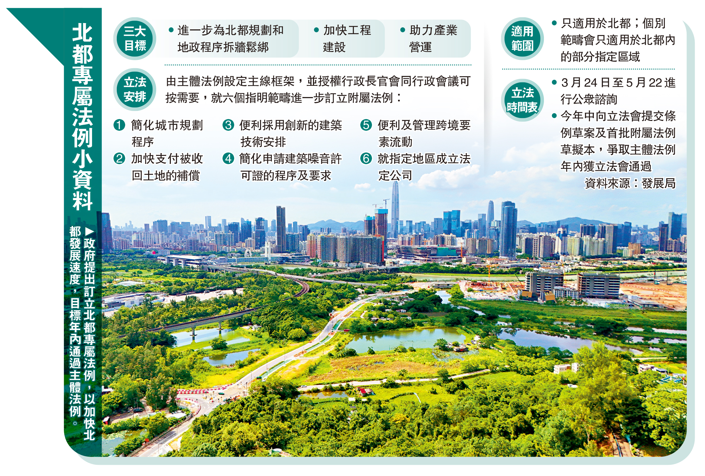 為加快北部都會區發展,政府提出訂立北都專屬法例,涵蓋簡化城市規劃程序、加快收地補償等,目標年內通過主體法例。發展局昨日起就北都專屬法例立法建議,展開為期兩個月公眾諮詢。