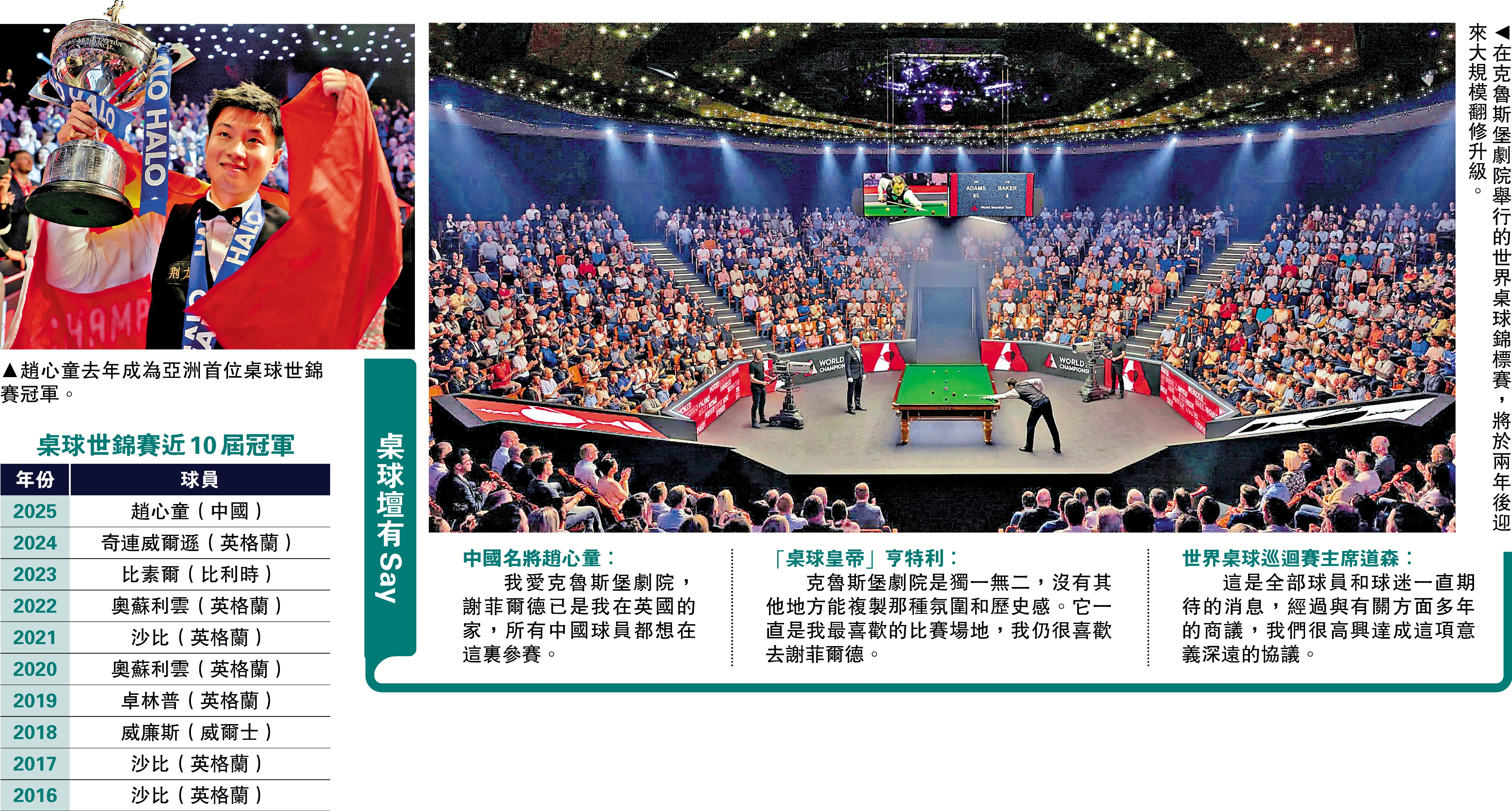 根據最新達成的協議,世界桌球錦標賽將至少在英國謝菲爾德的克魯斯堡劇院舉辦至2045年,並可選擇延長至2050年。世界桌球巡迴賽(WST)組織方在24日的聲明中同時確認,場館未來也將迎來一次大規模翻修升級,包括增加座位數目、改善設施等,以提升觀賽體驗。\大公報記者 梁潤森