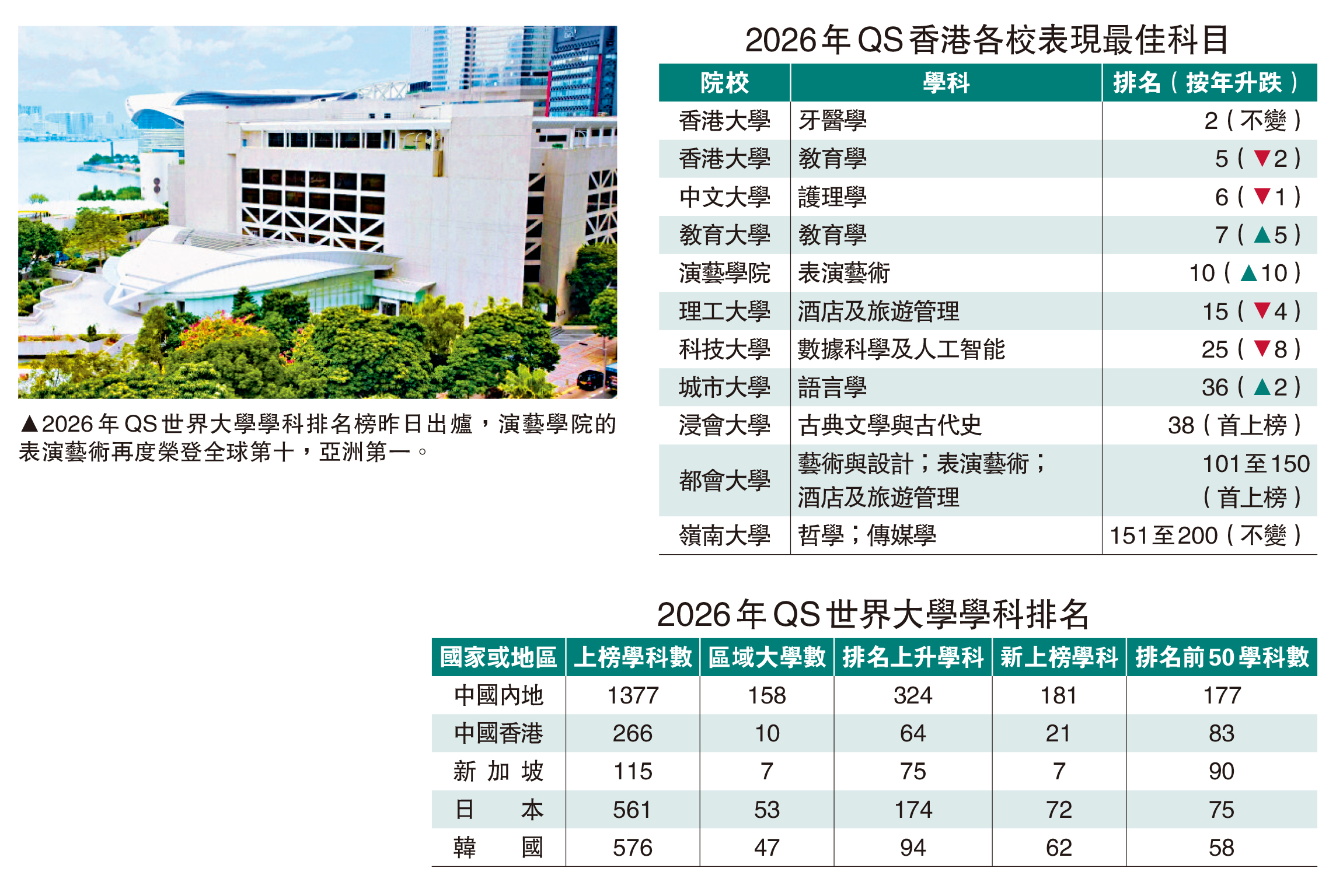 特區政府致力發展國際專上教育樞紐,本港專上院校近年在國際排名屢創佳績。據國際高等教育機構Quacquarelli Symonds(QS)昨日公布的2026年世界大學學科排名榜,香港有10間大學上榜,有266個學科納入排名,其中五個學科名列全球前10,共有83個學科躋身全球前50,成為區域內「高表現學科密度」最集中地區之一,不少規模更龐大的高等教育體系難以企及。其中,港大牙醫學繼續排名最高,位列全球第二。演藝學院的表演藝術再度榮登全球第十,亞洲第一。