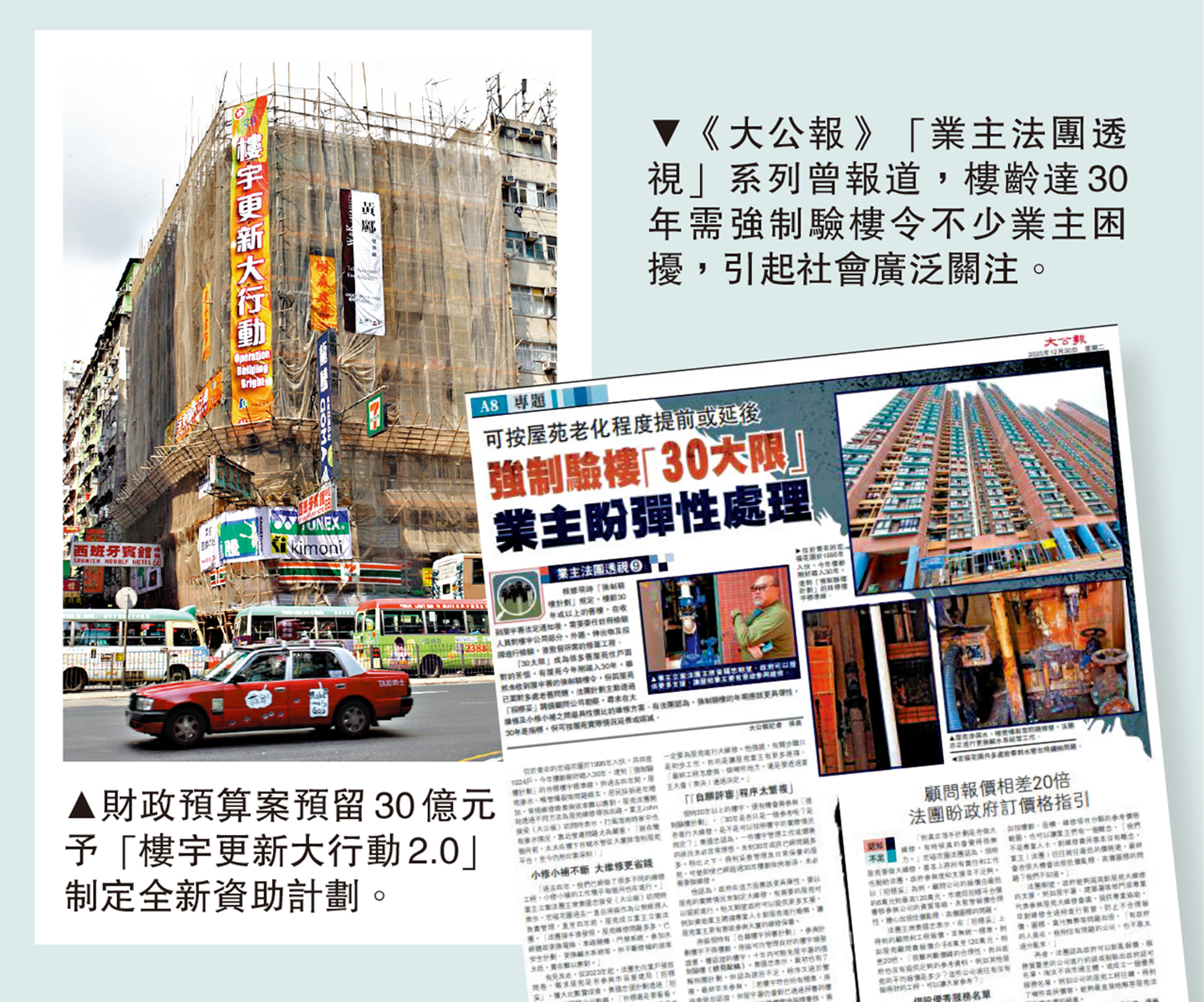 【大公報訊】記者肖泓宇報道:財政預算案預留30億元予「樓宇更新大行動2.0」制定全新資助計劃,發展局局長甯漢豪預計,會於明年初完成檢討,並敲定新資助計劃的細節。並於今年5月諮詢立法會,加強檢測樓宇服務,不同階段由市建局聘請驗樓人員,避免檢驗人員為招攬更多業務,不必要地誇大檢驗結果。