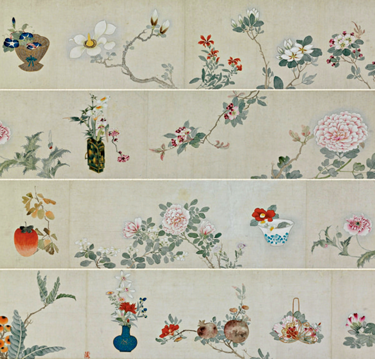 在眾多郵票中,面值五點五港元的郵票選用了清代宮廷畫家禹之鼎的《花果草蟲圖》(附圖,局部)。禹之鼎是康熙年間的名家,擅長人物,尤以肖像著稱,晚年亦涉獵花鳥山水。在這幅無紀年的手卷中,他兼用「雙鈎」與「沒骨」兩種技法,繪出四季花卉的生動姿態。所謂「雙鈎」,是以細線勾勒出花葉輪廓,再行填色,嚴謹而精緻;「沒骨」則不勾輪廓,直接以色彩點染,灑脫而自然。兩者並用,讓畫中花卉既結構分明,又水墨氤氳,草蟲穿梭其間,更是點睛之筆。