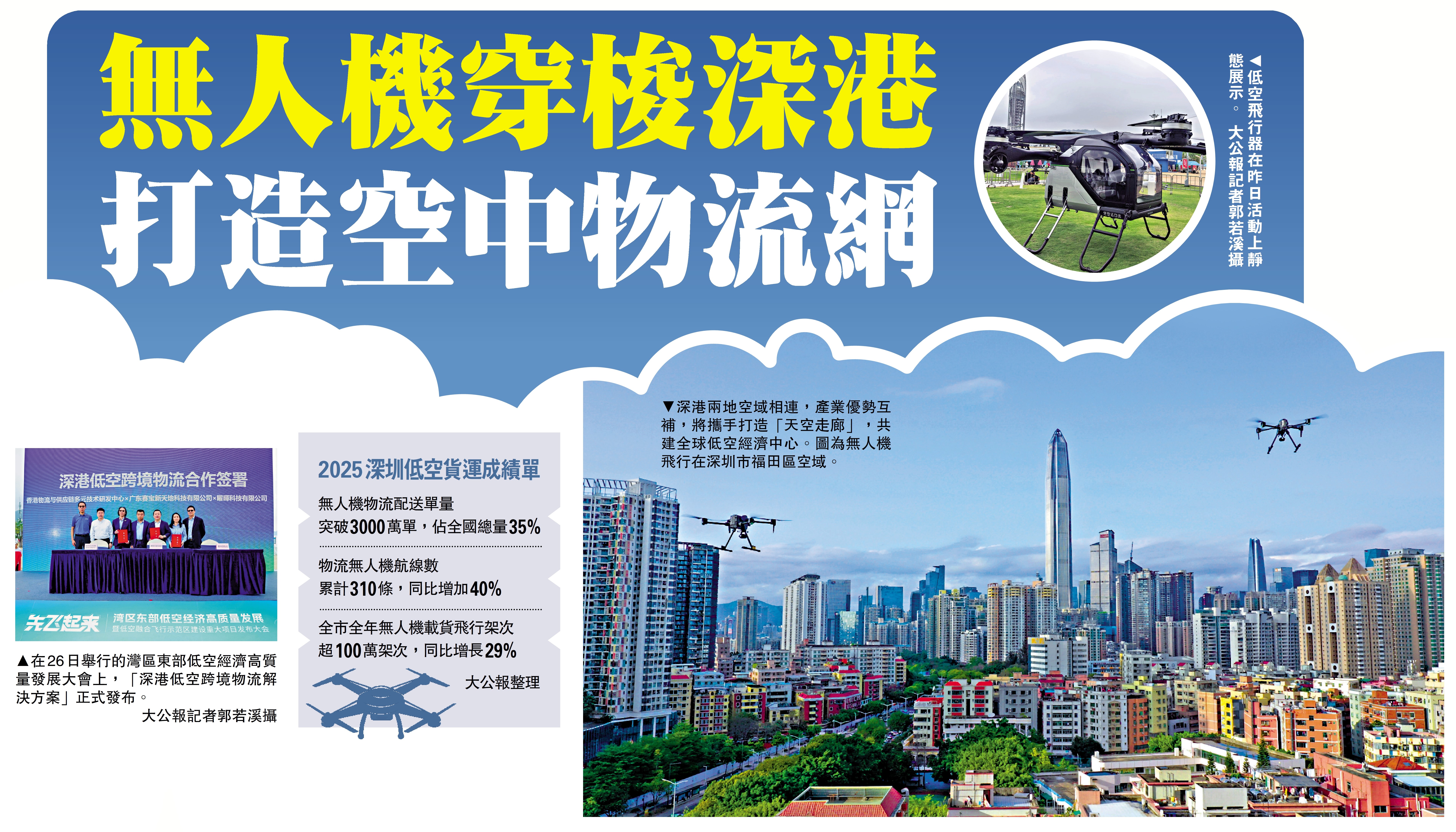 深港兩地空域相連,產業優勢互補,低空領域合作持續深化,深圳河上空可望織就「空中物流網」。昨日,深圳鹽田區舉辦「先飛起來─灣區東部低空經濟高質量發展大會」,「深港低空跨境物流解決方案」正式發布。
