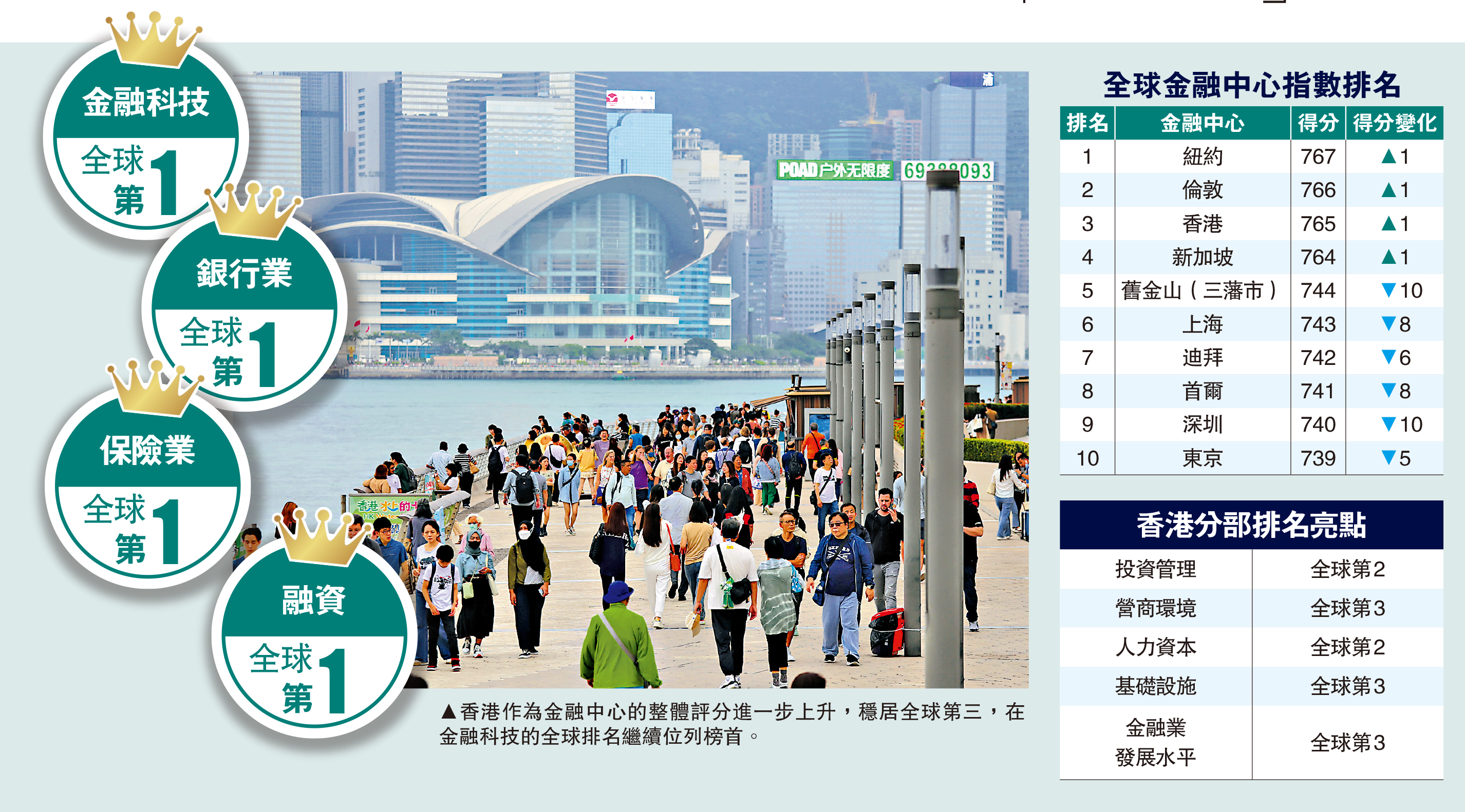 香港最新金融中心指數整體評分進一步上升至765分,繼續位列全球第三,亞太區第一。在各金融行業領域從業員的評價中,香港的排名普遍上升,其中香港在「銀行業」和「融資」躍居全球首位,「金融科技」、「保險業」繼續穩居全球第一,「投資管理」亦攀升至全球第二;在「營商環境」、「人力資本」、「基礎設施」、「金融業發展水平」及「聲譽及綜合」五個競爭力指標的排名繼續保持在全球三甲之列。