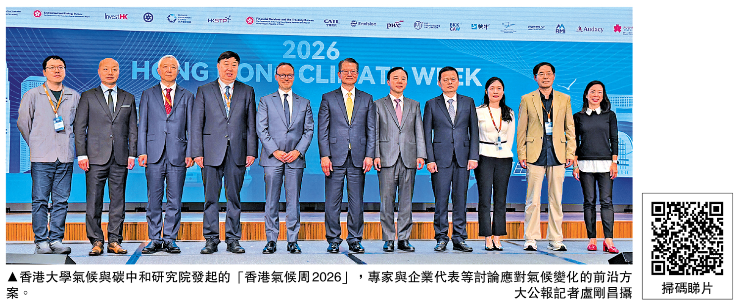 【大公報訊】記者郭如佳、蘇荣報道:氣候變化是全球面臨的主要挑戰之一,關乎全球生態、經濟和未來發展。香港大學氣候與碳中和研究院(ICCN)發起的「香港氣候周2026」昨日(26日)開幕,匯集近百名重量級人物,討論應對氣候變化的前沿方案,聚焦全球行動「從減緩轉向適應」的轉折點。財政司司長陳茂波表示,香港將發揮國際金融中心及新興全球創科樞紐的獨特優勢,提供資本與綠色科技、聯通市場與人才,推動各界協作。有企業代表認為,香港具有成為世界三大氣候創新樞紐之一的潛質。