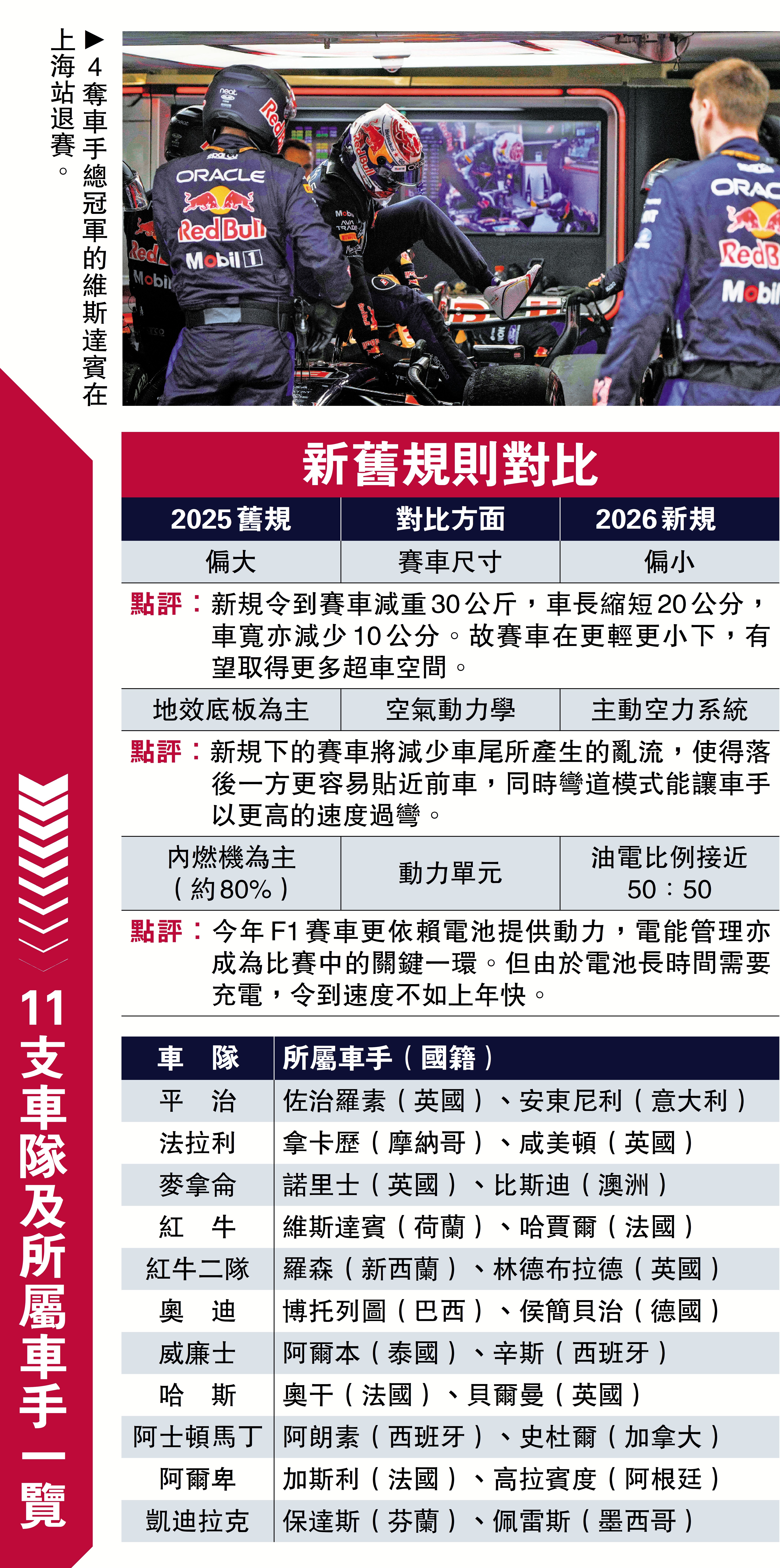 【大公報訊】2026年F1新規最大的改變來自於動力單元,令到車手需探索更高效的電池管理方式,同時賽車將有更多機會開啟超車模式,超車次數大為增加。雖然新規下的賽車技術並不成熟,速度亦不如上季快,但仍有不少新的看點。