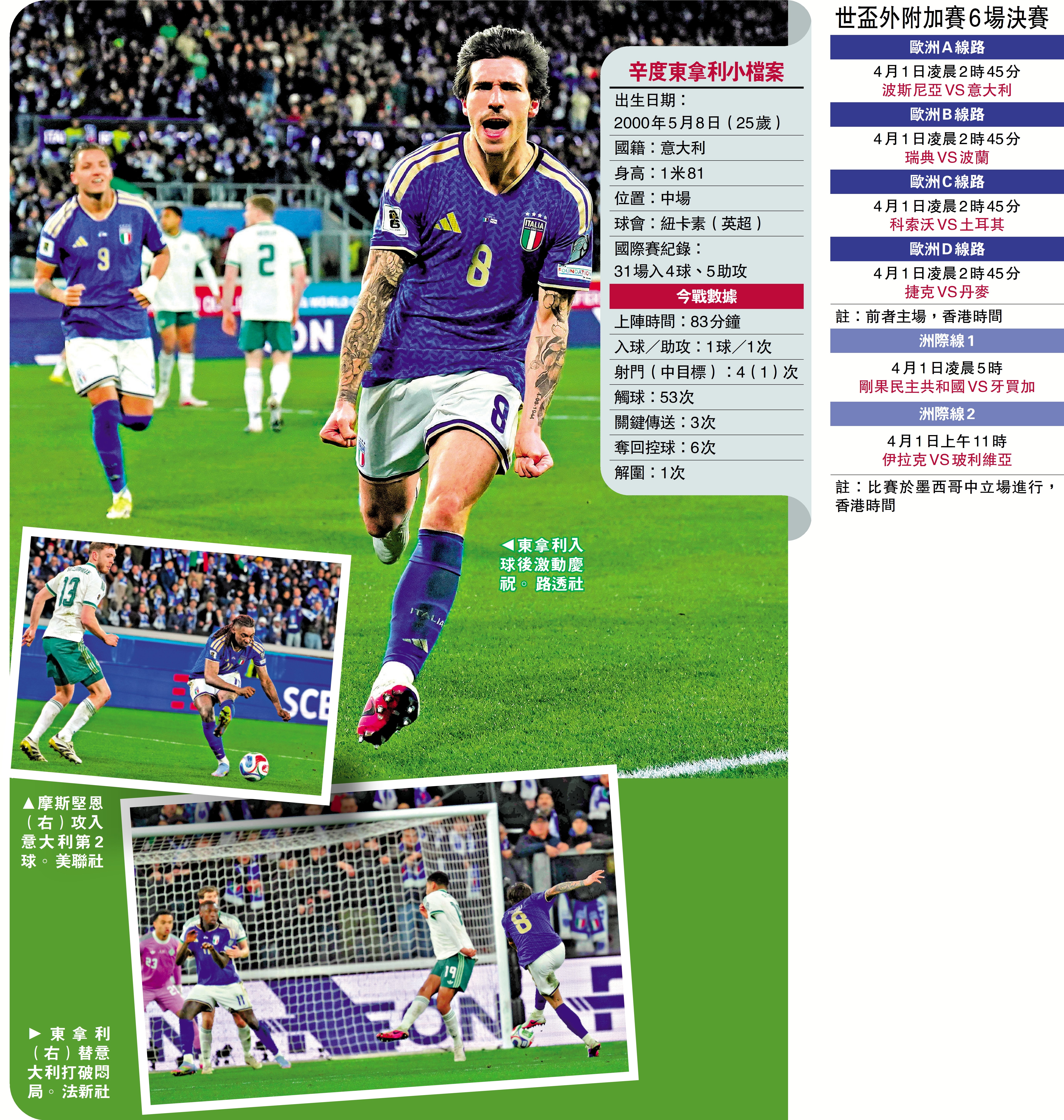 力圖避免遭逢連續缺席3屆世界盃「巨災」的意大利,香港時間27日凌晨先過首關,於外圍賽歐洲區附加賽A線路準決賽,在貝加莫主場以2:0擊退實力較次的北愛爾蘭,將於4月1日凌晨的決賽作客波斯尼亞,爭奪其中一張進軍今夏美墨加決賽周的入場券;效力英超紐卡素的意大利中場辛度東拿利,今仗表現極具領軍大將之風,並貢獻了1入球、1助攻。曾經4次捧盃的意大利,能否在時隔12年後再度亮相世界盃決賽周,東拿利勢必成為關鍵先生。\大公報記者 譚德龍