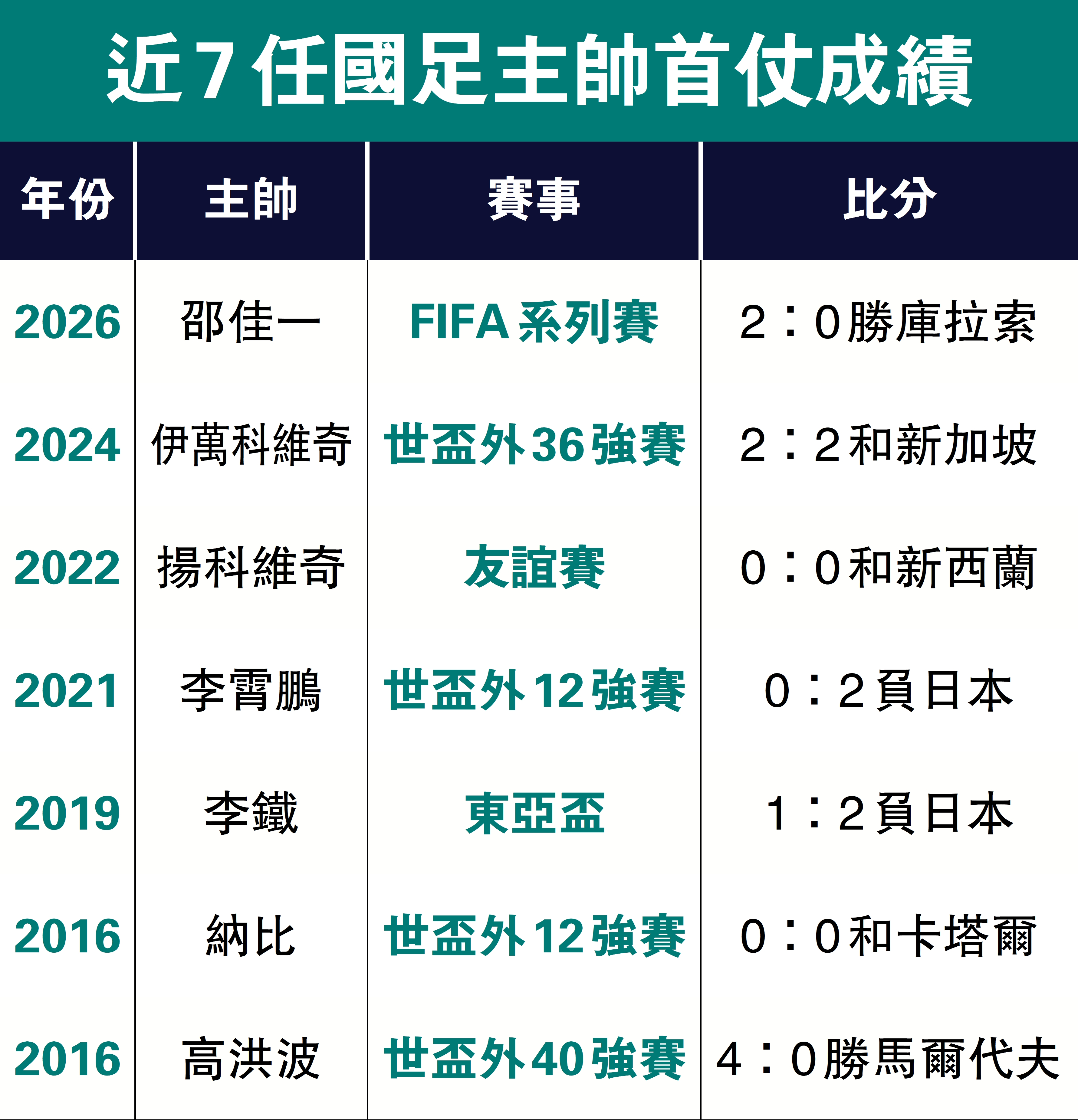 據統計,邵佳一是國足近6位正式主帥中,唯一一個在首場比賽取得開門紅的教練,此前伊萬科維奇、揚科維奇、李霄鵬、李鐵和納比,5人都沒能在首秀中取勝。而邵佳一之前,國足新帥首仗即取勝是高洪波,他2016年帶領球隊出戰2018年世盃外圍賽40強賽,以4:0擊敗馬爾代夫。