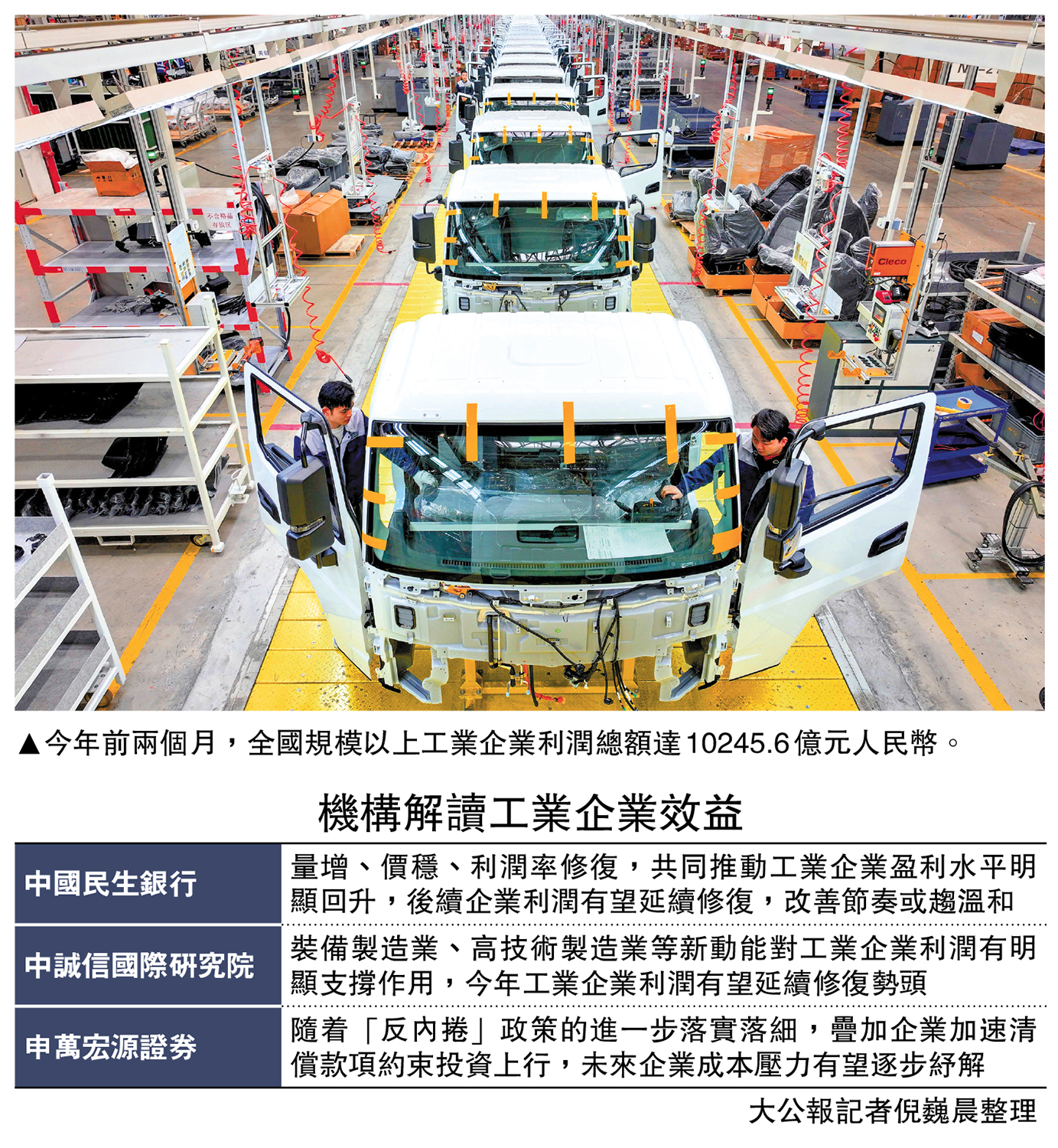 規模工業企業效益錄得「開門紅」。國家統計局數據顯示,今年前兩個月,全國規模以上工業企業利潤總額10245.6億元(人民幣,下同),按年增長15.2%,增速較上年全年加快14.6個百分點;同期,規模工業企業營收20.84萬億元,按年增長5.3%,較上年全年加快4.2個百分點。國家統計局工業司首席統計師于衛寧介紹,得益於存量和增量政策集成效應的顯現,規模工業企業利潤加快增長,多數行業利潤回升,企業效益持續恢復。\大公報記者 倪巍晨
