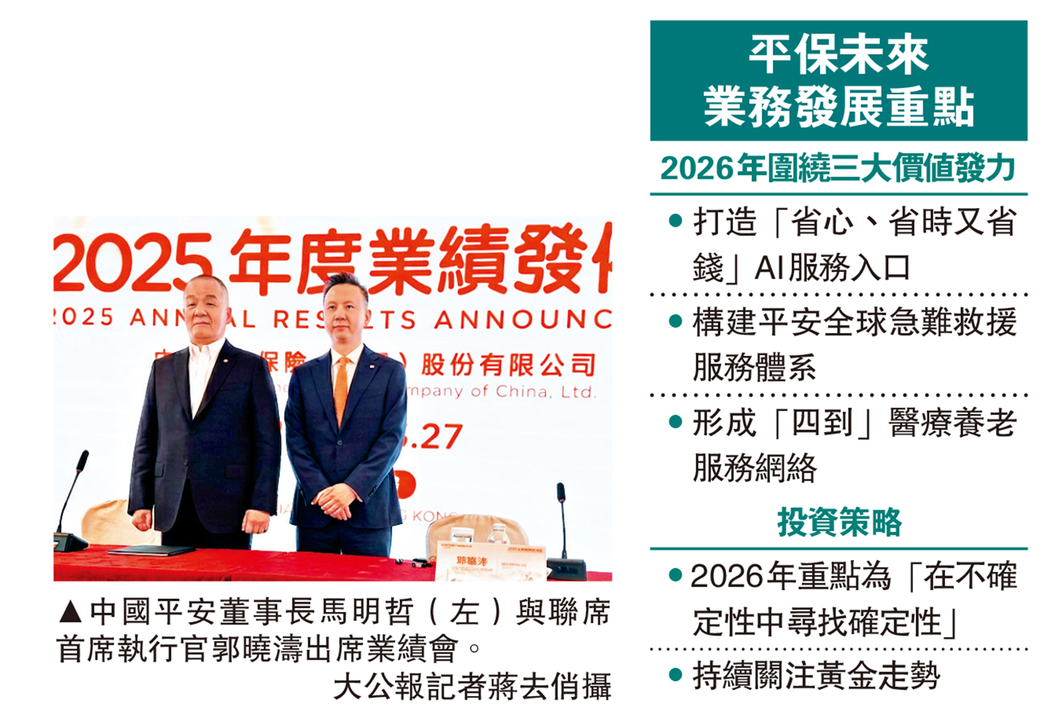 【大公報訊】實習記者張超然報道:中國平安(02318)聯席首席執行官郭曉濤昨表示,集團作為專注長期的耐心資本,短期波動不重要,關鍵是提供長期穩健可持續的回報。他強調,將堅持在不確定中尋找確定性,在「十五五」戰略機遇中,與國家發展同頻共振。他又透露,去年初以來積極配置黃金,目前投資回報已達預期,未來將持續關注,並列為策略性資產之一。