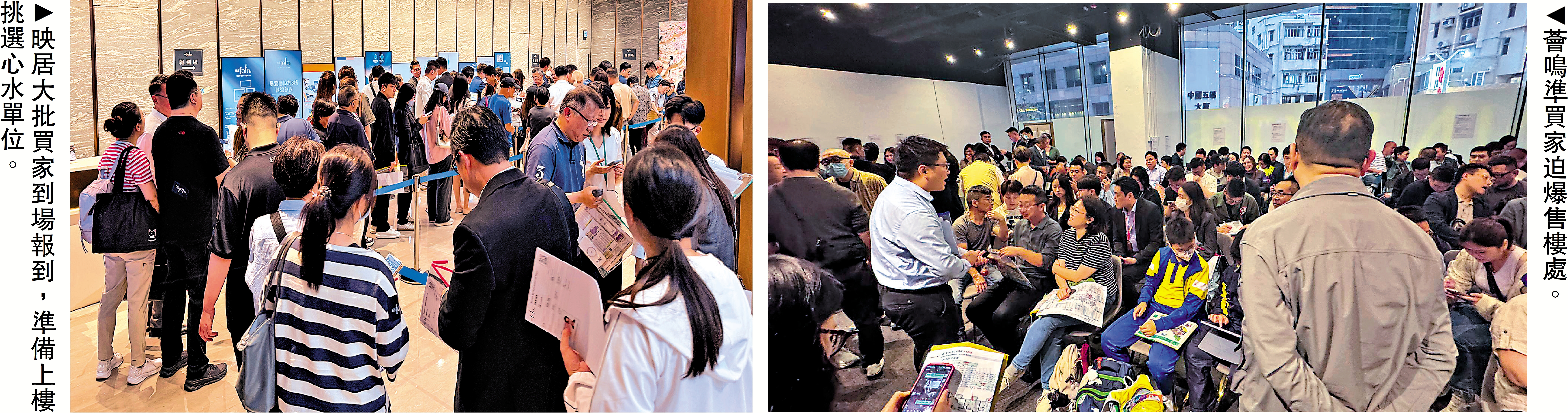 至於只截收582票,相對遜色的薈鳴,昨日首輪推售100伙,發展商安排傍晚6時起報到並一組過揀樓,準買家魚貫到場並坐爆揀樓區,場面熱鬧。據發展商公布,截至9時約40伙獲認購,售出比率40%。