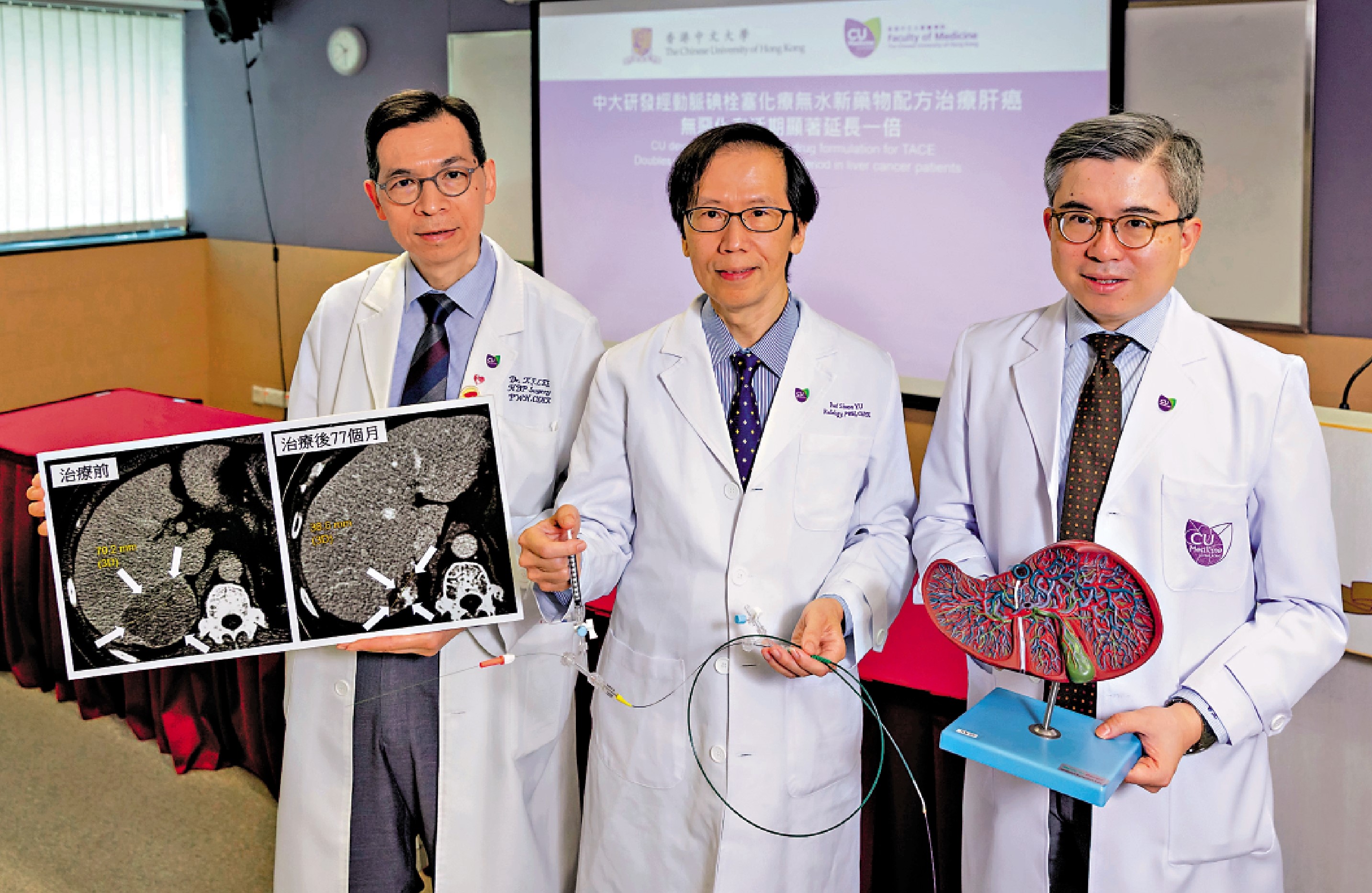 【大公報訊】記者郭如佳報道:肝癌是本港第三大癌症殺手,在十大常見癌症中排第五位。香港中文大學醫學院團隊在傳統「經動脈碘栓塞化療」基礎上,研發出以無水純化療藥「順鉑」配合碘化油的新配方(aTACE),臨床試驗展現突破性效果,九成患者的腫瘤在影像上完全消除,遠高於傳統配方近一倍,整體存活期較中位數延長約一倍,消滅腫瘤效果顯著,相關研究結果已於國際權威期刊《Radiology》發表。