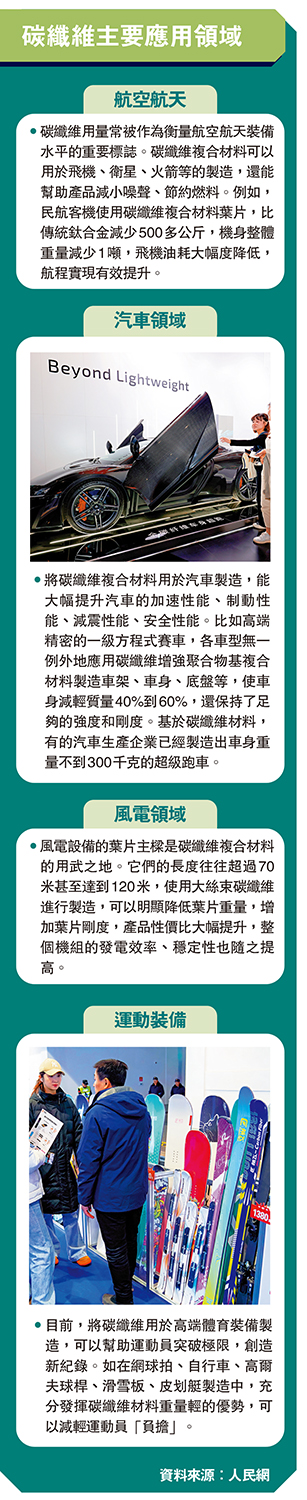 •碳纖維用量常被作為衡量航空航天裝備水平的重要標誌。碳纖維複合材料可以用於飛機、衛星、火箭等的製造,還能幫助產品減小噪聲、節約燃料。例如,民航客機使用碳纖維複合材料葉片,比傳統鈦合金減少500多公斤,機身整體重量減少1噸,飛機油耗大幅度降低,航程實現有效提升。