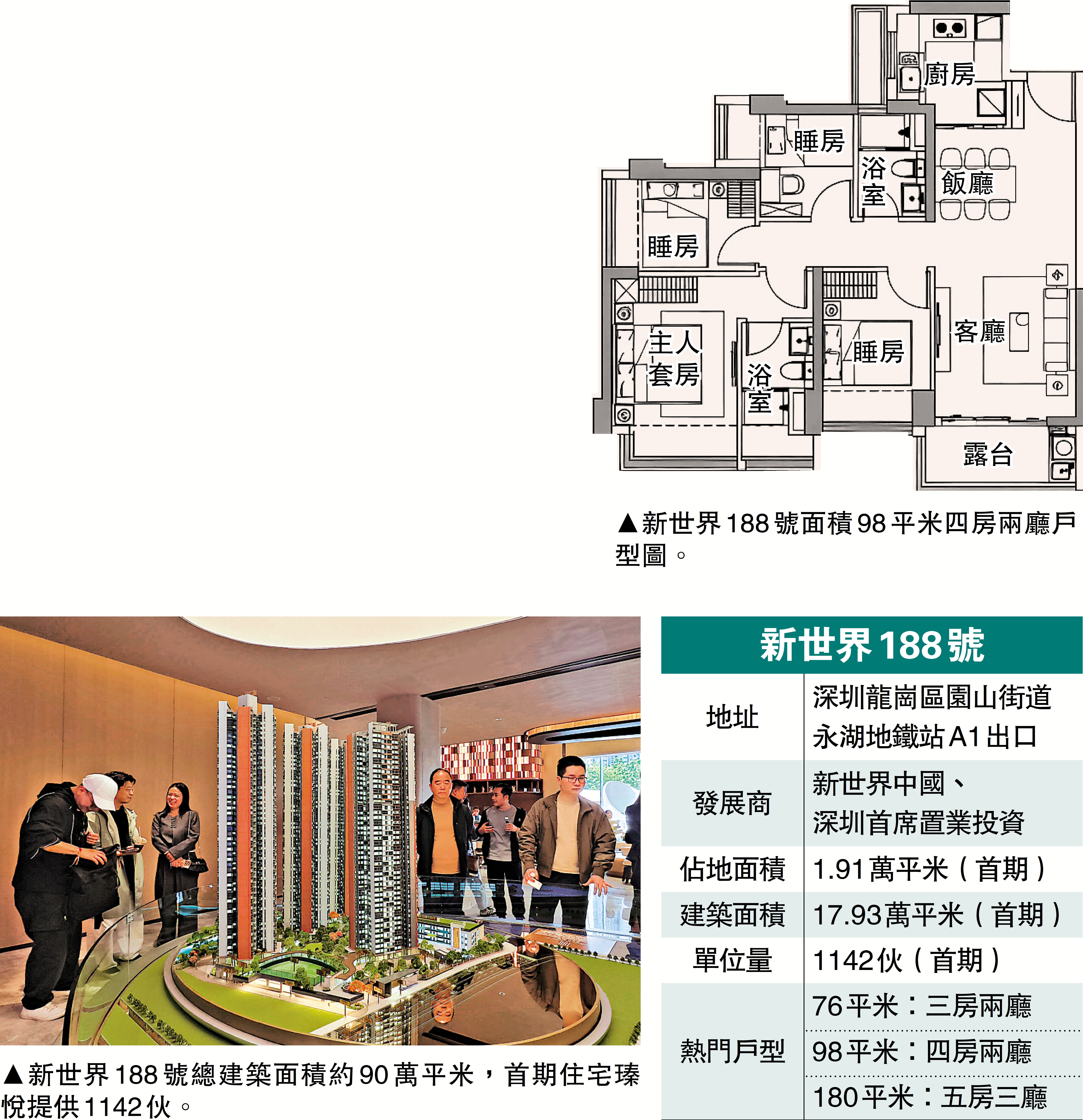 新世界發展執行董事兼新世界中國行政總裁陳耀豪介紹,新世界188號前身為橫崗188工業區城市更新單元,總建築面積約90萬平米,涵蓋約35萬平米國際住宅社區、約6萬平米步入式商業街區、約22萬平米辦公集群、約4800平米幼兒園,以及社區健康服務中心、文化活動中心、超大型地下停車空間等全齡段公共服務設施,是目前深圳東部核心區規模領先、業態覆蓋全面的產城融合綜合體。