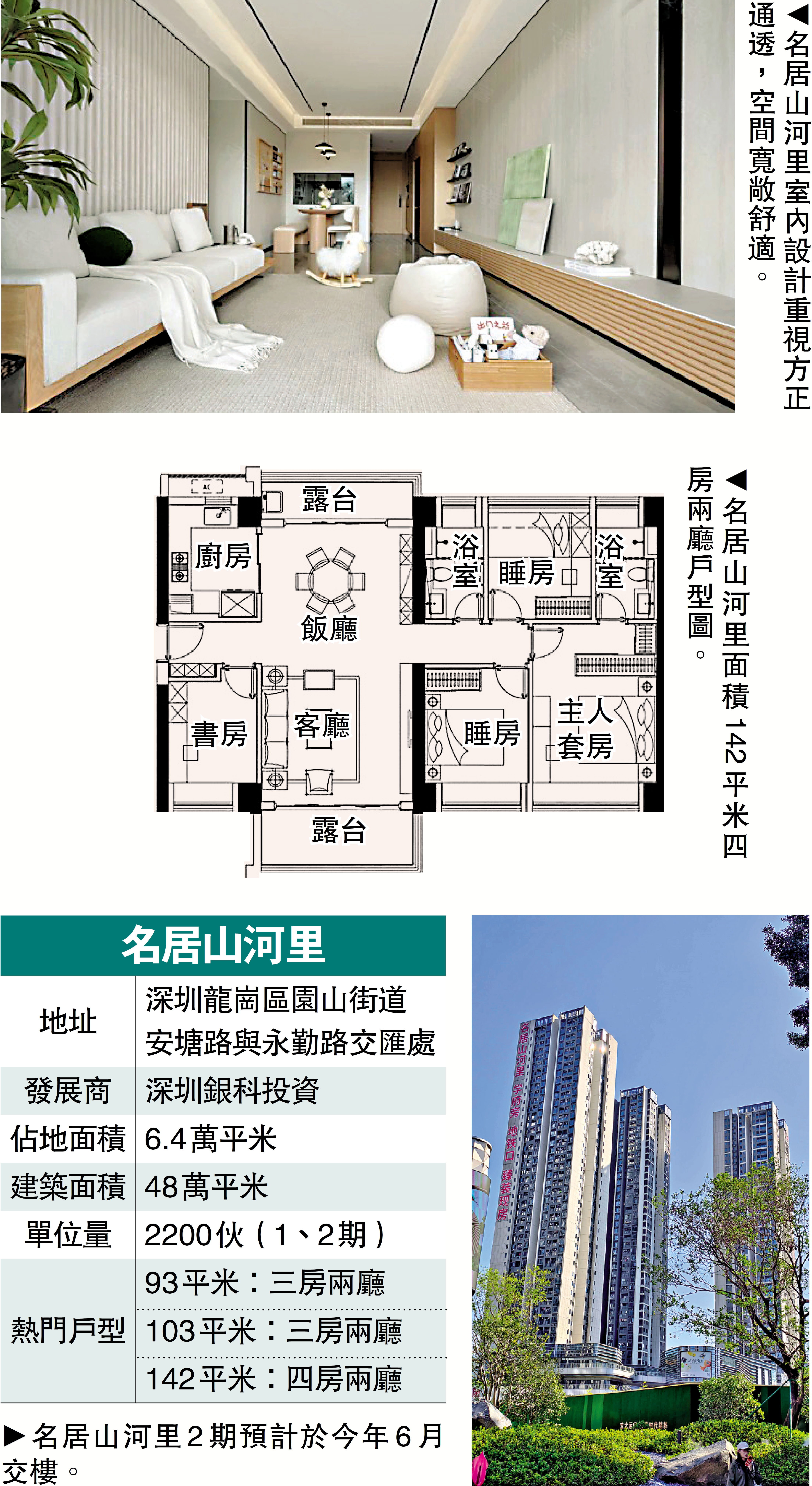 名居山河里共3期,1期已交付,2期將於今年6月精裝交房。項目採用鋁板+石材+玻璃立面,打造6米高雙首層入戶大堂,三梯五戶設計確保居住私密性。社區內規劃約5000平米街心公園,南側緊鄰2.4公里梧桐山河碧道,串聯五大生態公園,形成「推窗見綠、下樓親水」的生態格局。
