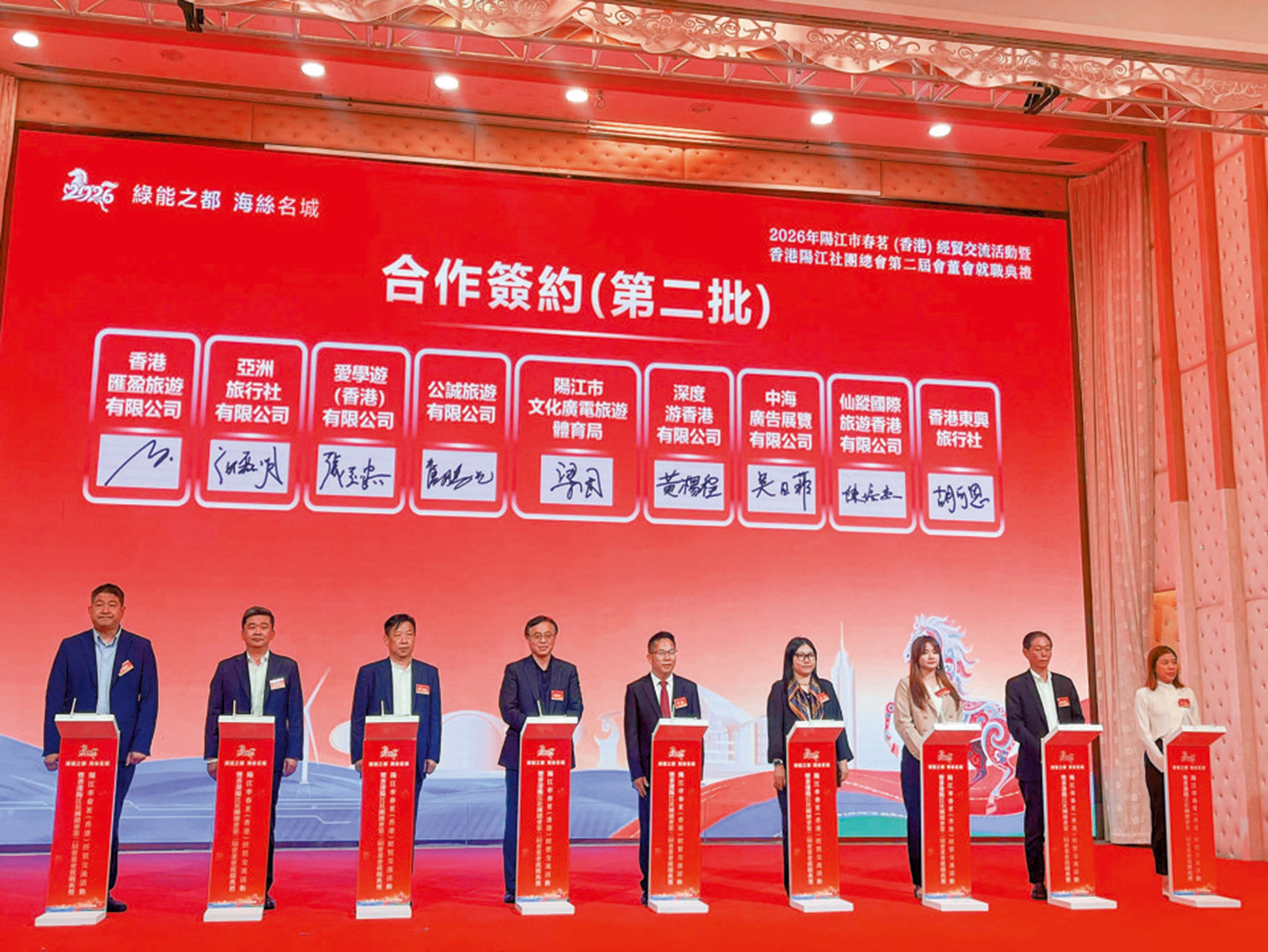 【大公報訊】記者帥誠、徐紅報道:2026陽江市春茗(香港)經貿交流會暨香港陽江社團總會第二屆會董會就職典禮昨日在香港舉辦,300多位來自香港政商界代表及社團負責人齊聚,共謀合作發展。香港立法會議員何俊賢、周浩鼎、林振昇、何敬康、方國珊、張培剛,中央政府駐港聯絡辦社團聯絡部副部長胡啟明、九龍工作部副部長郭長勇、新界工作部副部長朱宜華,全國政協常委、香港廣東社團總會主席龔俊龍等領導嘉賓出席活動。