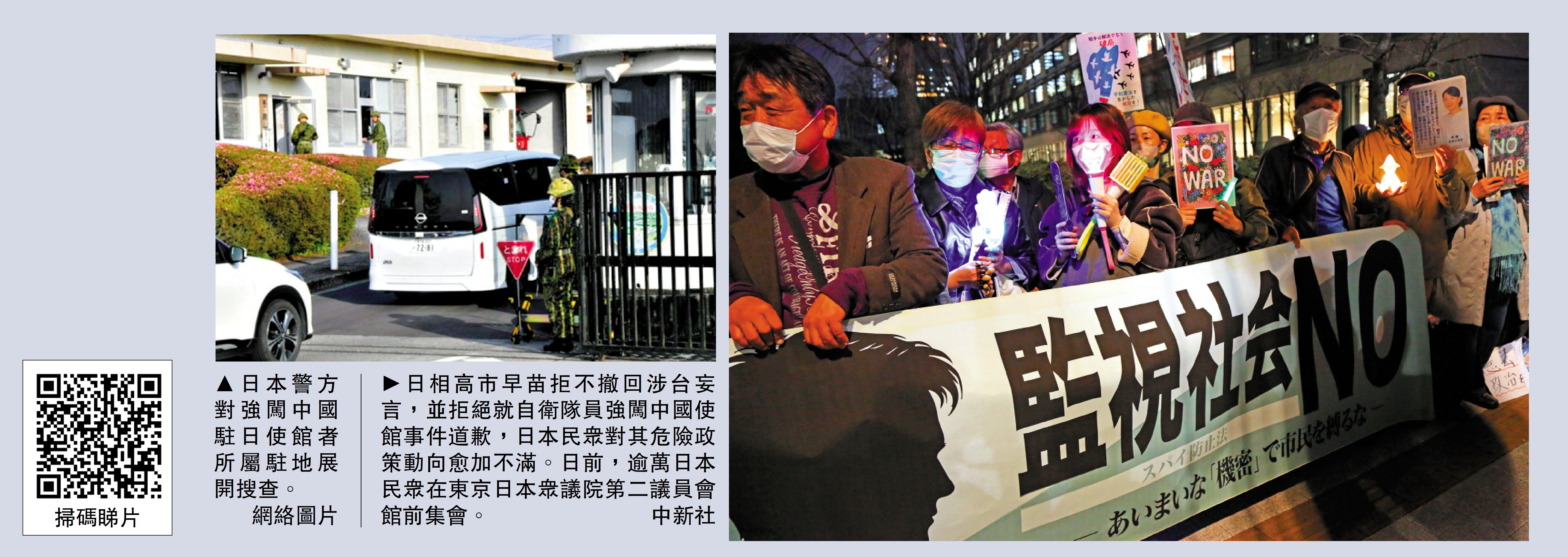 【大公報訊】據新華社報道:28日,日本民眾在東京新宿舉行集會,呼籲和平、反對戰爭。抗議人群高喊口號,要求高市政府就強闖使館事件道歉。昨日,再有上千名日本民眾在東京新宿舉行集會,參加者主要是年輕人。多名抗議者受訪時表示,此次強闖使館事件駭人聽聞,難以想像竟會發生在今天的日本。這一事件極大損害日本的國際形象,如不及時作出負責任的處理,恐將進一步加劇周邊國家不信任情緒,給日中關係帶來負面影響。