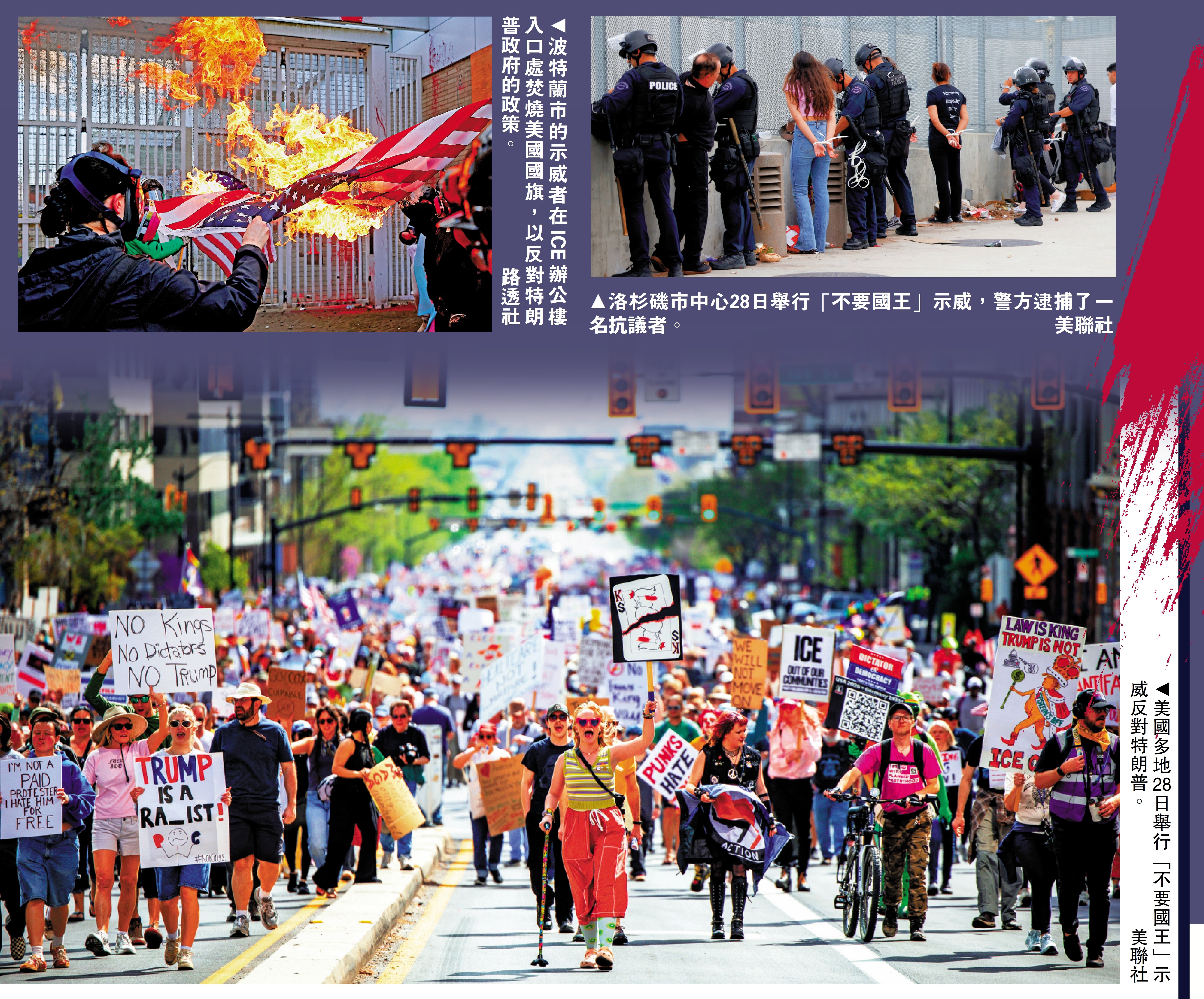 當地時間28日,全美50個州陸續舉行「不要國王」(No Kings)反特朗普示威。各地大批民眾湧上街頭,高舉標語,針對特朗普政府的移民執法等一系列政策表達不滿,呼籲結束對伊朗的軍事打擊。據估計,當天參與示威的總人數超過900萬人,較之前兩次「不要國王」示威時更多。示威持續至當晚,其間洛杉磯、波特蘭等城市出現衝突,多人被逮捕。