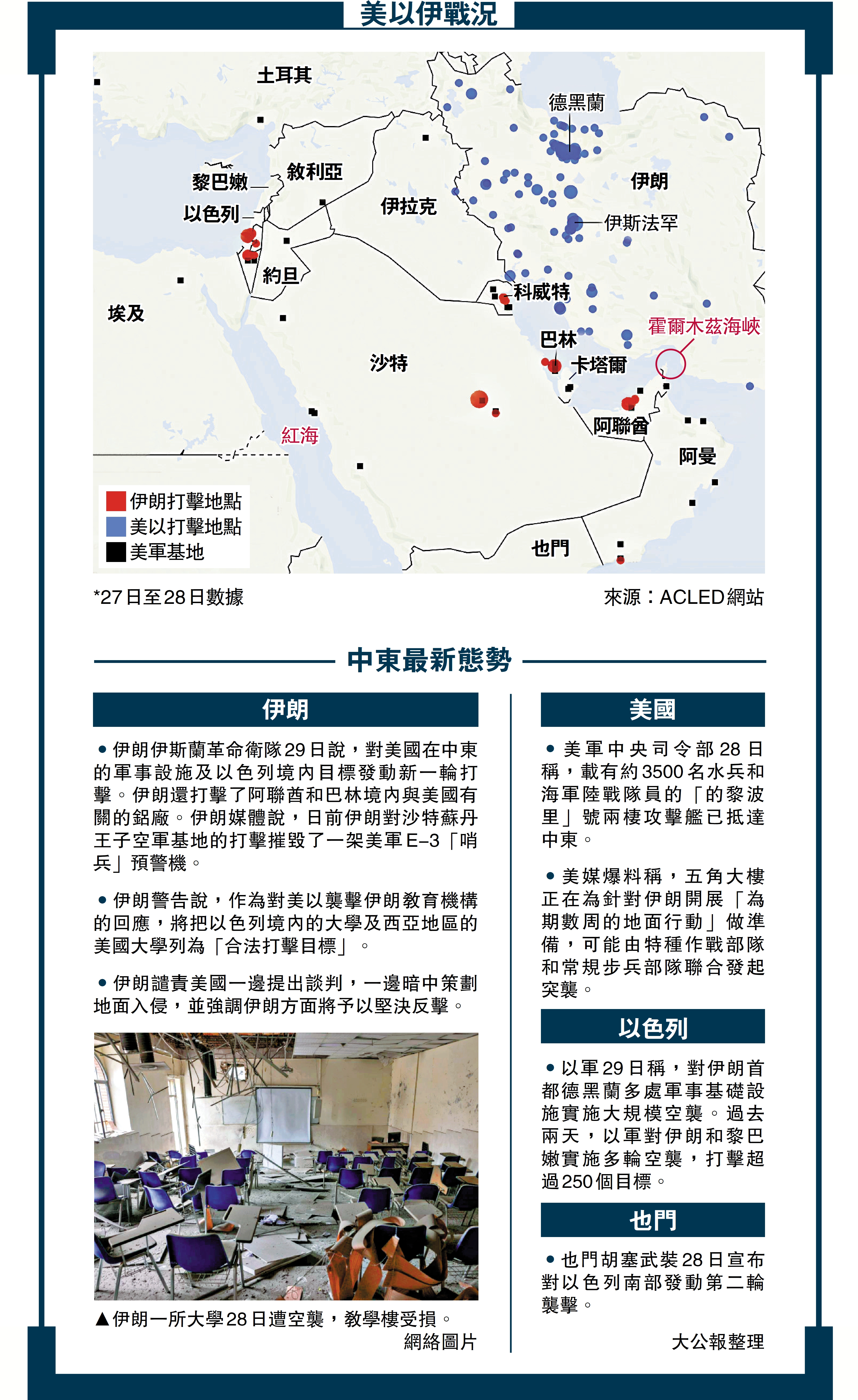 •伊朗伊斯蘭革命衛隊29日說,對美國在中東的軍事設施及以色列境內目標發動新一輪打擊。伊朗還打擊了阿聯酋和巴林境內與美國有關的鋁廠。伊朗媒體說,日前伊朗對沙特蘇丹王子空軍基地的打擊摧毀了一架美軍E-3「哨兵」預警機。