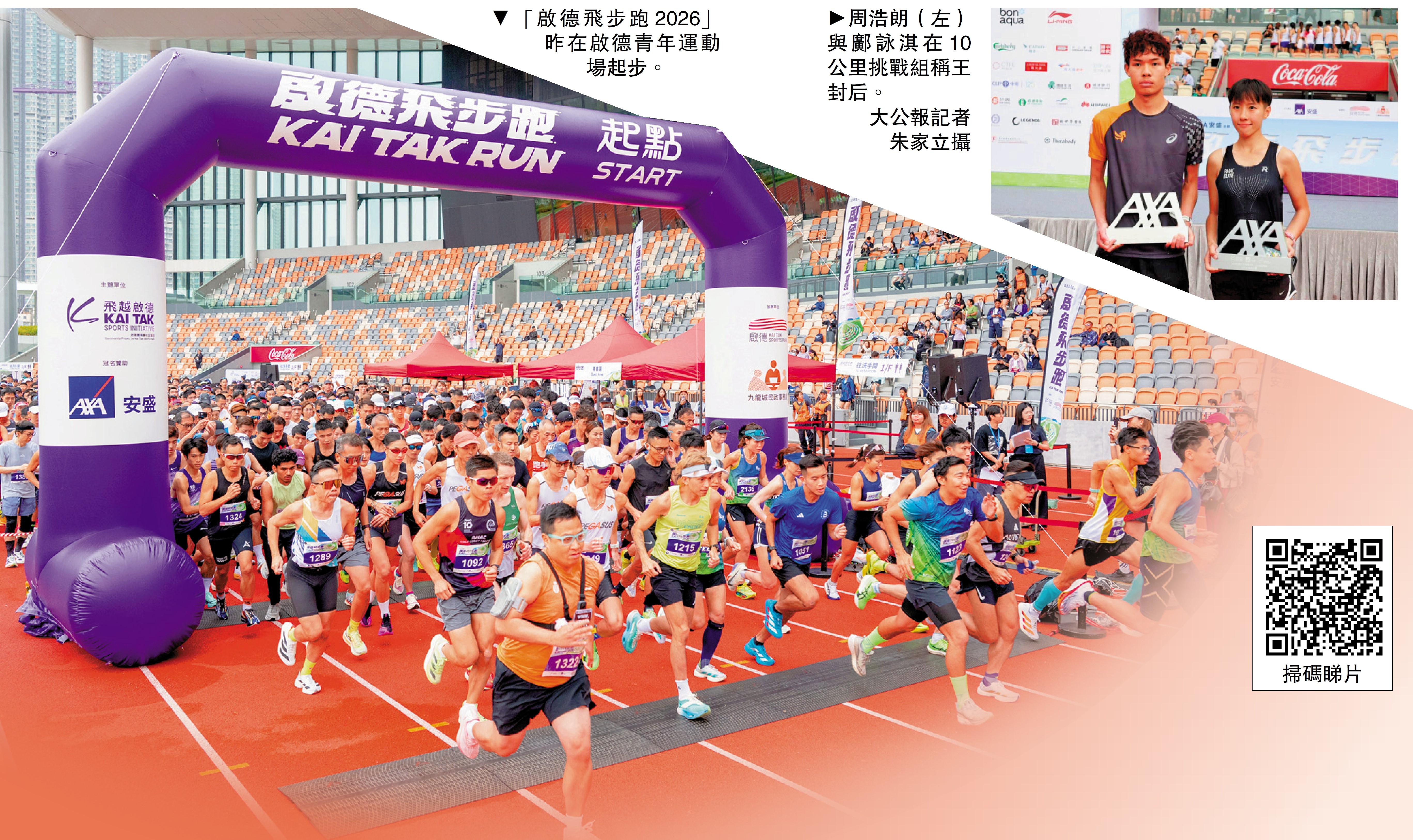 由飛越啟德主辦,啟德體育園及九龍城民政事務處協辦的「啟德飛步跑2026」於29日結束,今年賽事首設連接啟德海濱長廊的10公里全新賽道,廣獲參賽者讚賞,吸引逾4300名跑手參與,當中包括多名香港政界、社福界及體育界人士,共同推廣全民運動。最終周浩朗奪得男子10公里挑戰組冠軍,鄺詠淇則在女子10公里挑戰組封后,二人賽後更點讚賽道環境優美,選手可以一邊賽跑一邊觀賞沿途美景。\大公報記者 朱家立