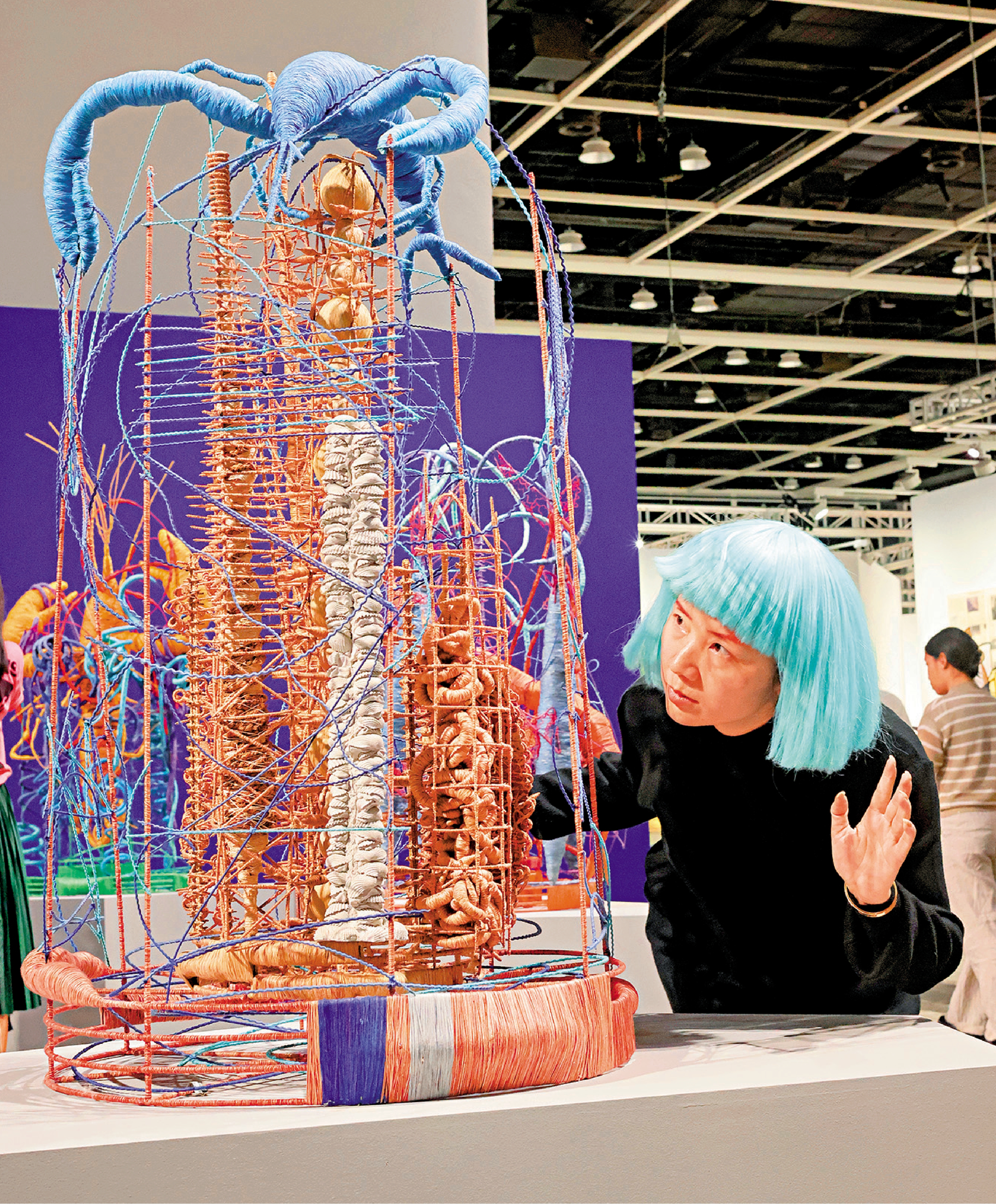 今年巴塞爾藝術展香港展區現場裝置作品種類豐富。內地行為藝術家劉海濤亦在場內多次進行即興互動,從「能量」的角度觀看展覽,形成一套不同於一般觀眾的觀展方式。