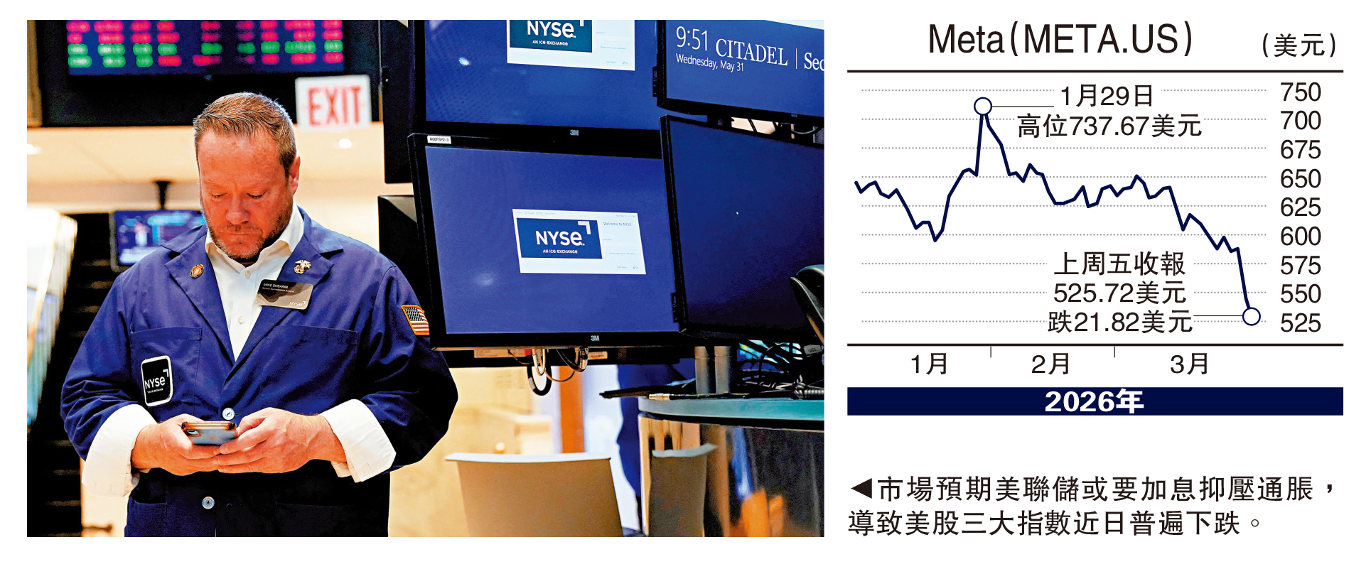 近周環球股市沽貨套現潮持續,其中華爾街股市反彈乏力跌幅進一步擴大,道指與科技股為主的納指已雙雙從歷史高位回調10%,正式步入技術性調整,轉勢向下十分明顯,美國七大科技股市值在過去一周蒸發逾8000億美元,其中Meta(META.US)、谷歌母企Alphabet(GOOG.US)股價單周急跌逾11%及接近9%,顯示美國科技股沽壓沉重。即使特朗普表示美伊談判取得進展,予人中東戰事有望結束的感覺,但醒目投資者以實際行動對特朗普投下不信任票,加快沽貨步伐,令今年來道指、標指、納指跌幅分別達到6.03%、6.96%及9.87%,美股投資信心逐步潰散。