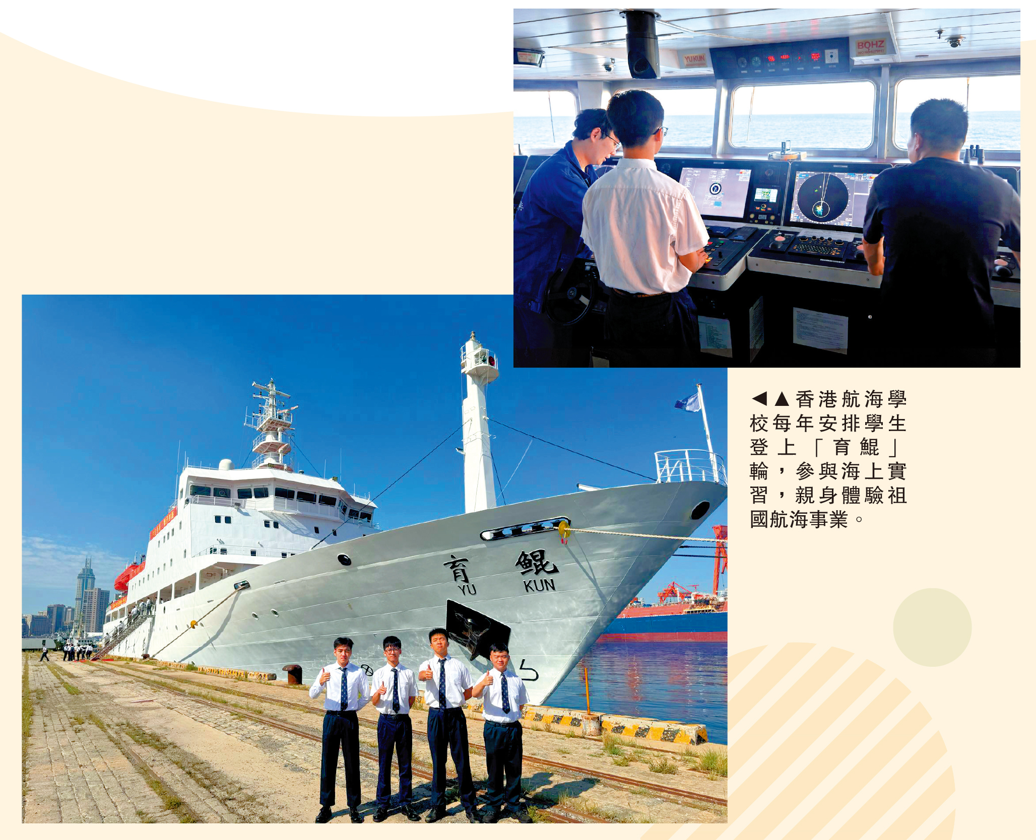 兩地交流愈加頻繁。梁老師表示,很多學校在內地進行一些比較有特色的交流活動。他以香港航海學校為例,曾以龍舟為主題,透過海上活動和水上活動訓練,讓學生了解文化差異和系統運作。另外,梁老師每年都會安排學生登上中國第一艘自行開發設計、引進關鍵設備的現代化專用航海教學實習船「育鯤」輪,參與海上實習,讓他們親身體驗祖國航海事業如何發展,激發學生對航海的興趣以及培養堅毅的精神。