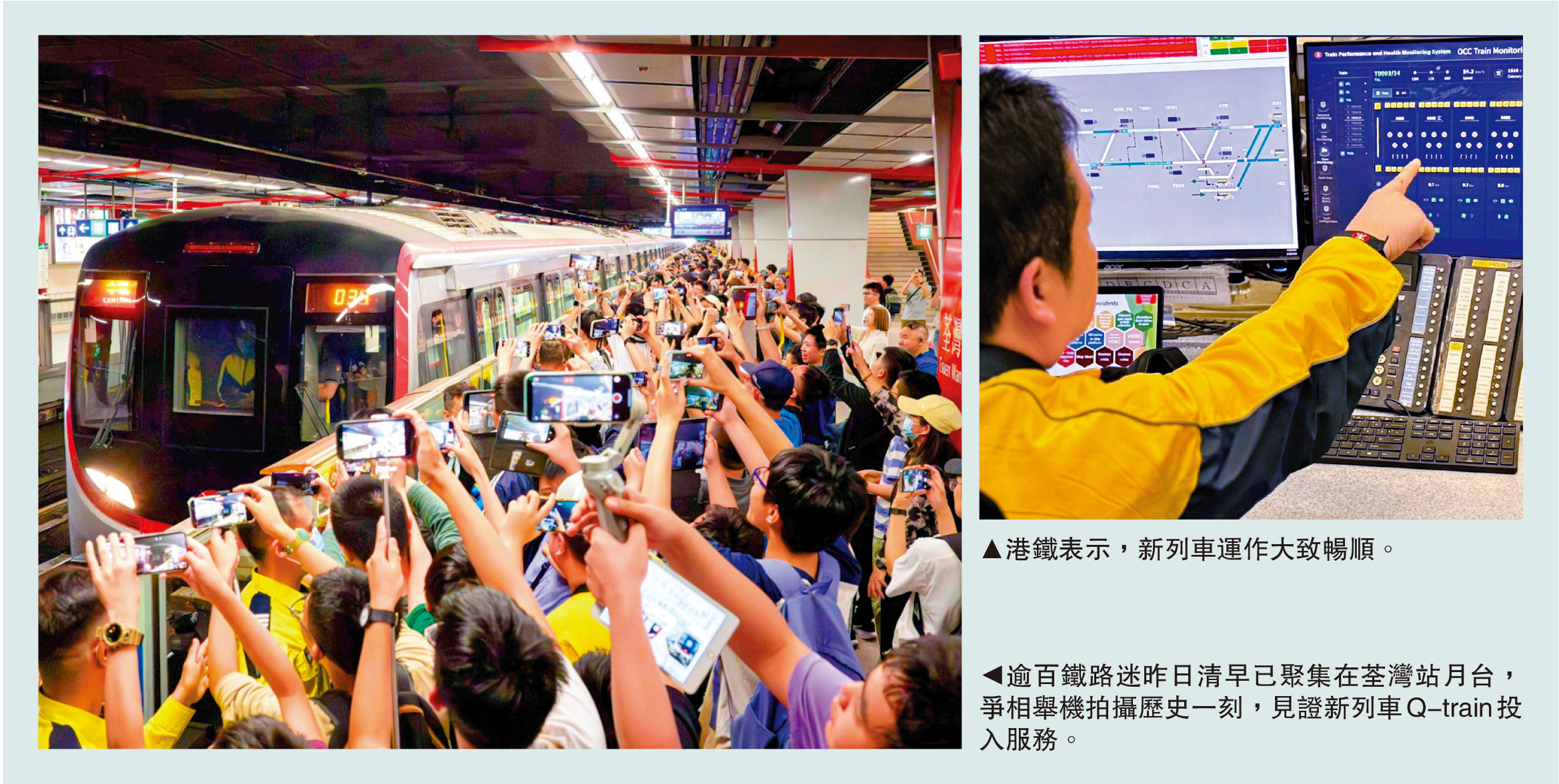 昨日一早,港鐵荃灣站月台擠滿等候的鐵路迷,現場氣氛高漲。當列車駛入月台時,在場鐵路迷紛紛舉起手機相機拍攝,並報以歡呼及掌聲。有鐵路迷更特意攜帶Q-train模型、手繪畫作到場,表現興奮,在列車上亦頻頻舉機,拍照留念。