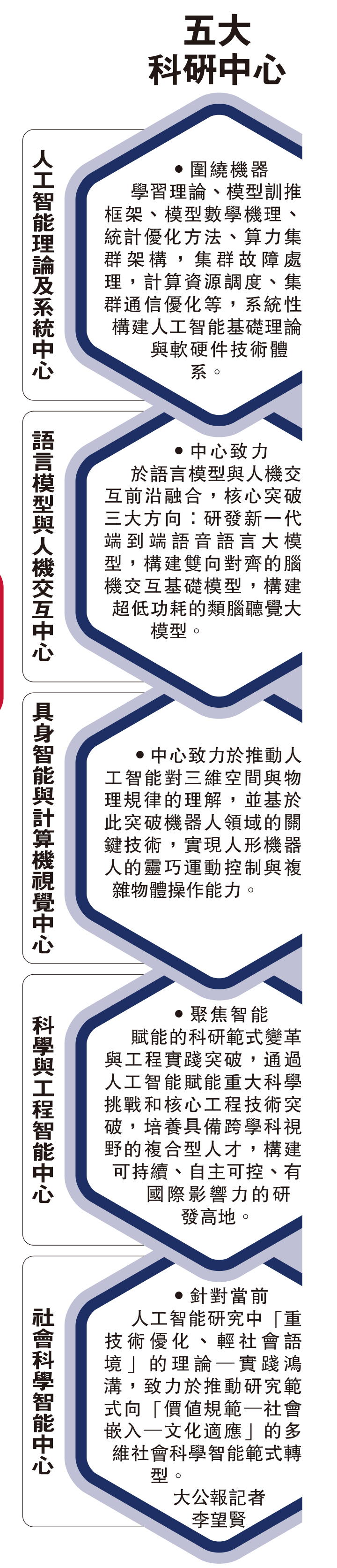 •聚焦智能賦能的科研範式變革與工程實踐突破,通過人工智能賦能重大科學挑戰和核心工程技術突破,培養具備跨學科視野的複合型人才,構建可持續、自主可控、有國際影響力的研發高地。