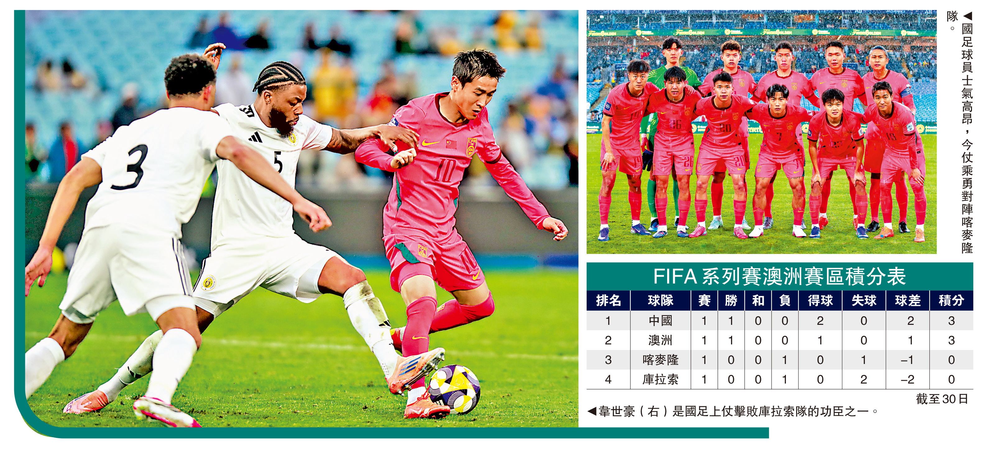 中國男子足球隊將在31日下午2時再度出戰於澳洲舉行的國際足聯(FIFA)系列賽,對陣世界排名第45位的非洲勁旅喀麥隆隊。國足27日在系列賽首仗以2:0擊敗世界盃決賽周球隊庫拉索,主教練邵佳一取得領軍首秀開門紅。國足近期多次操練「三中堅」陣容,延續上仗的良好精神面貌。今仗面對缺少前鋒麥比奧莫與門將奧拿拿的喀麥隆,士氣高昂的國足必定希望乘勝追擊,力爭兩連捷。\大公報記者 朱家立